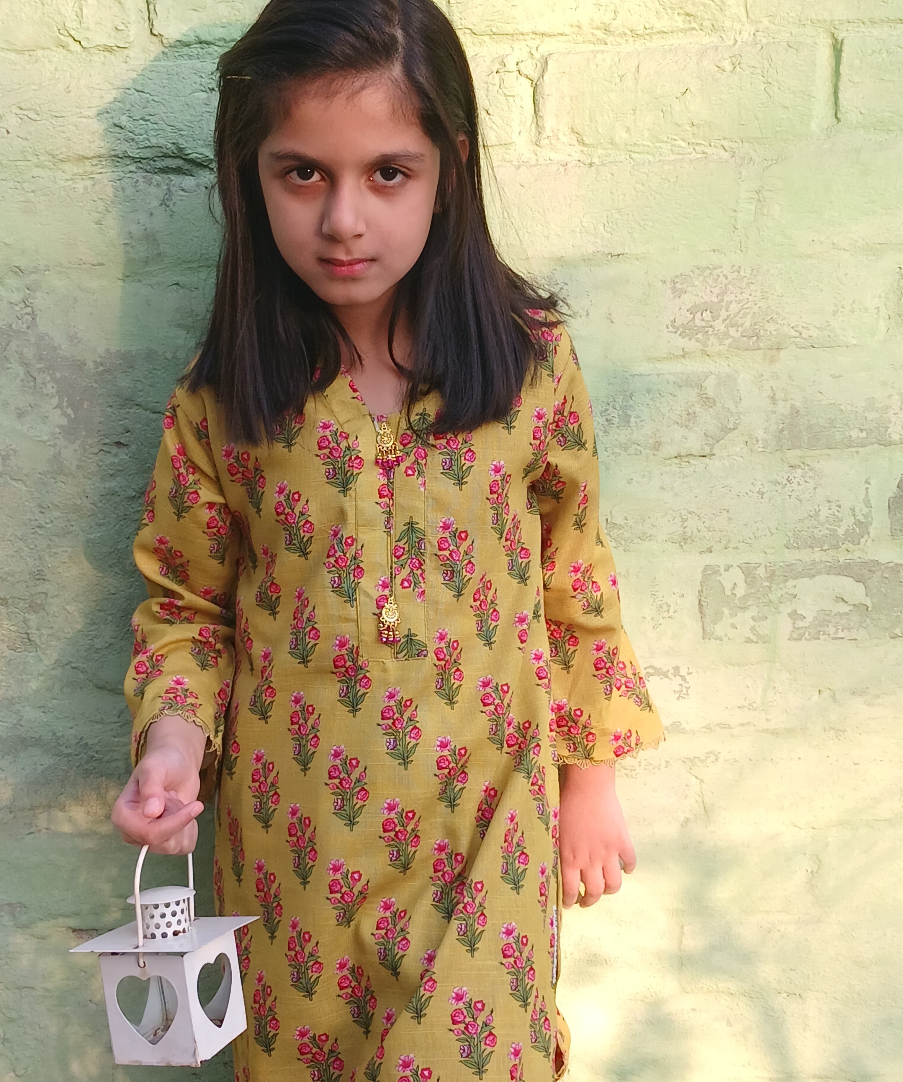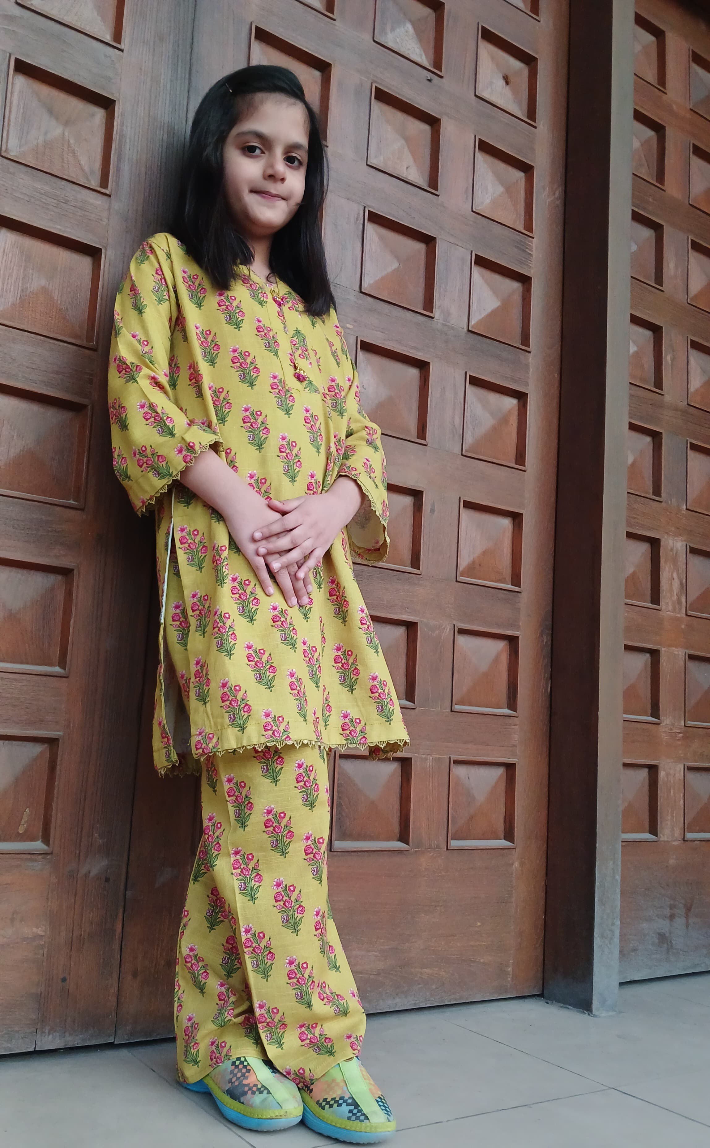 Sunny Floral Co-ord Set for 6 to 9 years Bring a pop of sunshine to your little one's wardrobe with this vibrant mustard co-ord set. Its cheerful floral design and comfortable fit make it a perfect pick for a playful day.