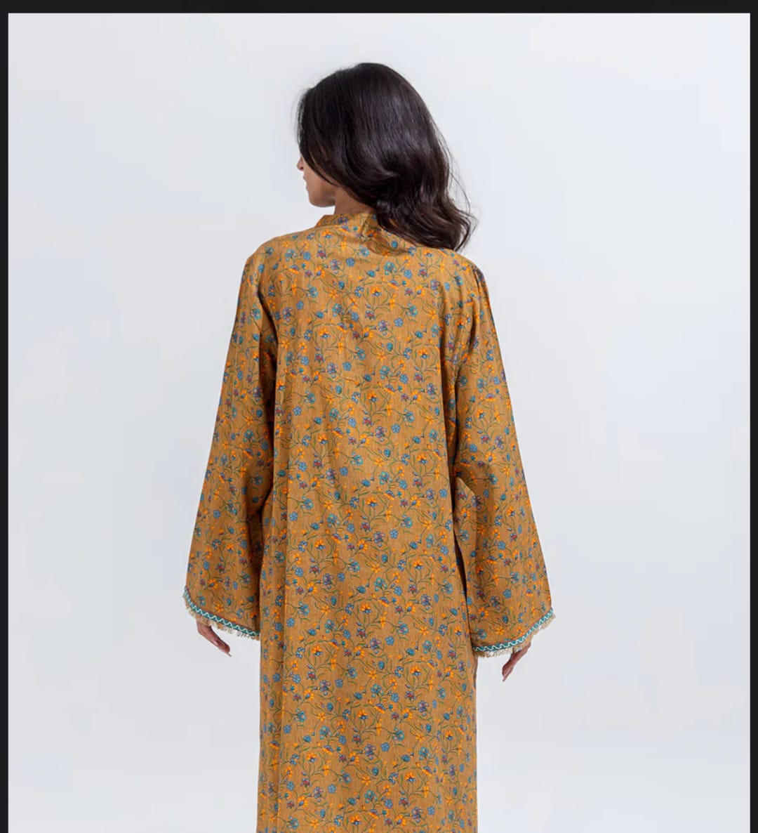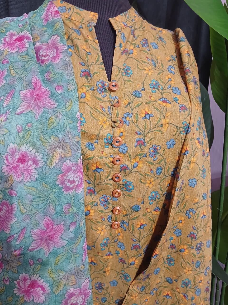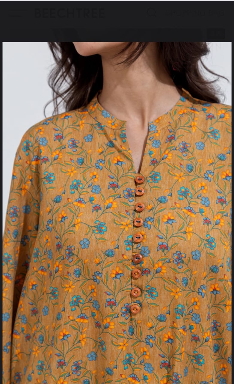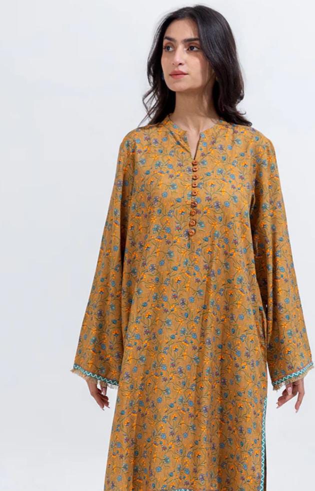 A warm mustard shirt with soft floral embroidery and wooden button accents, paired with a mint green dupatta blooming with pink roses. A refreshing blend of tradition and charm — perfect for everyday elegance.