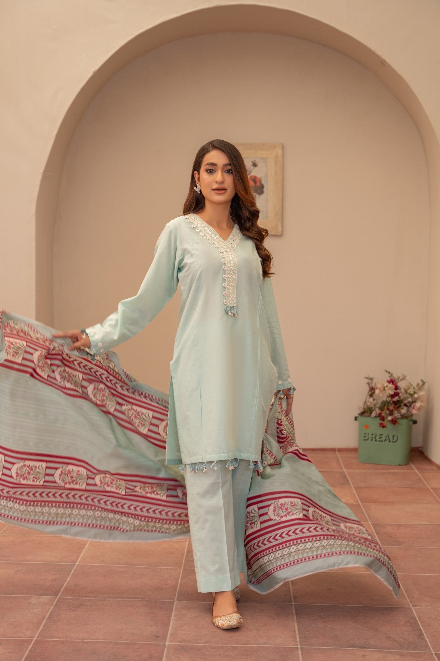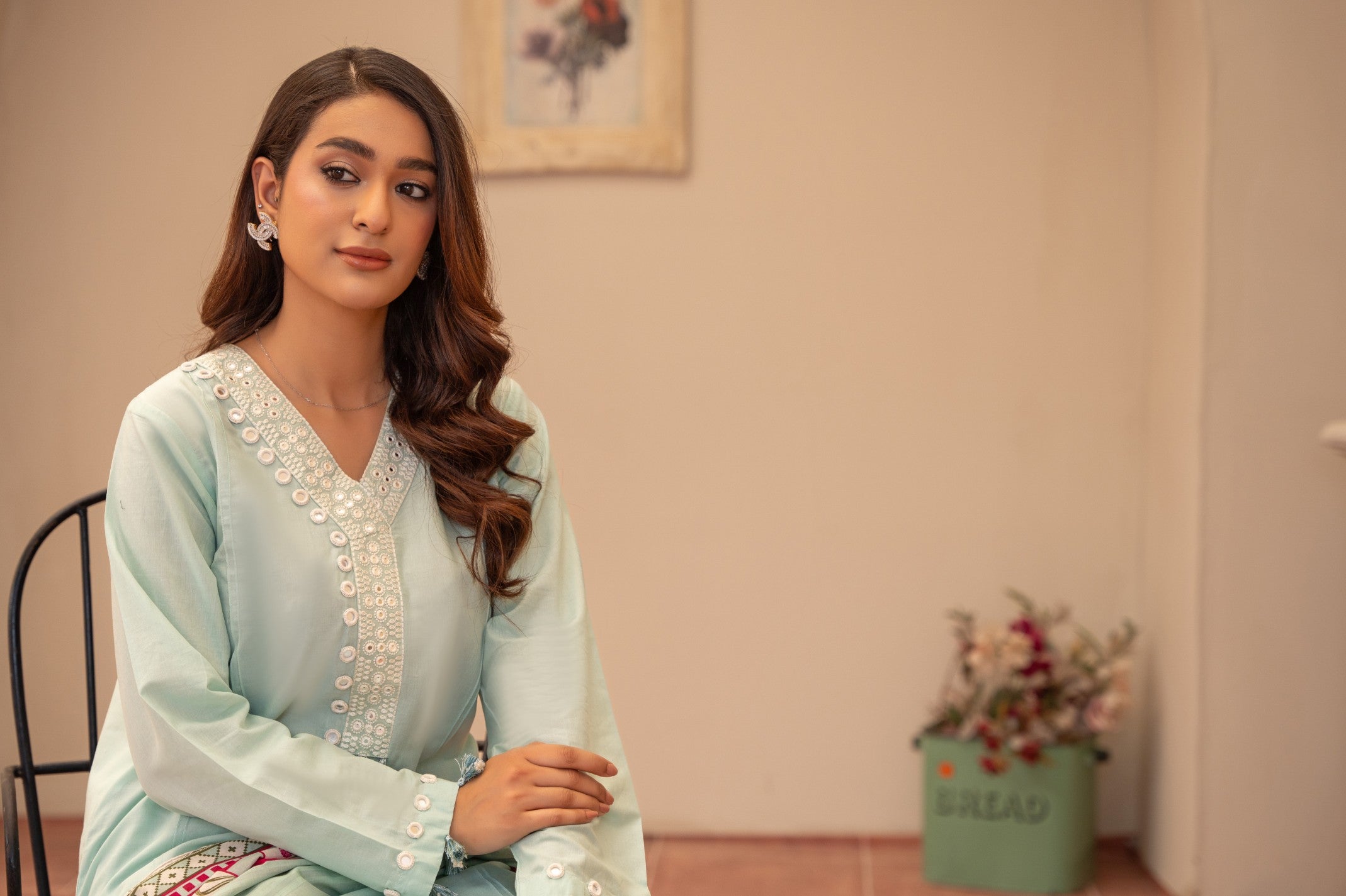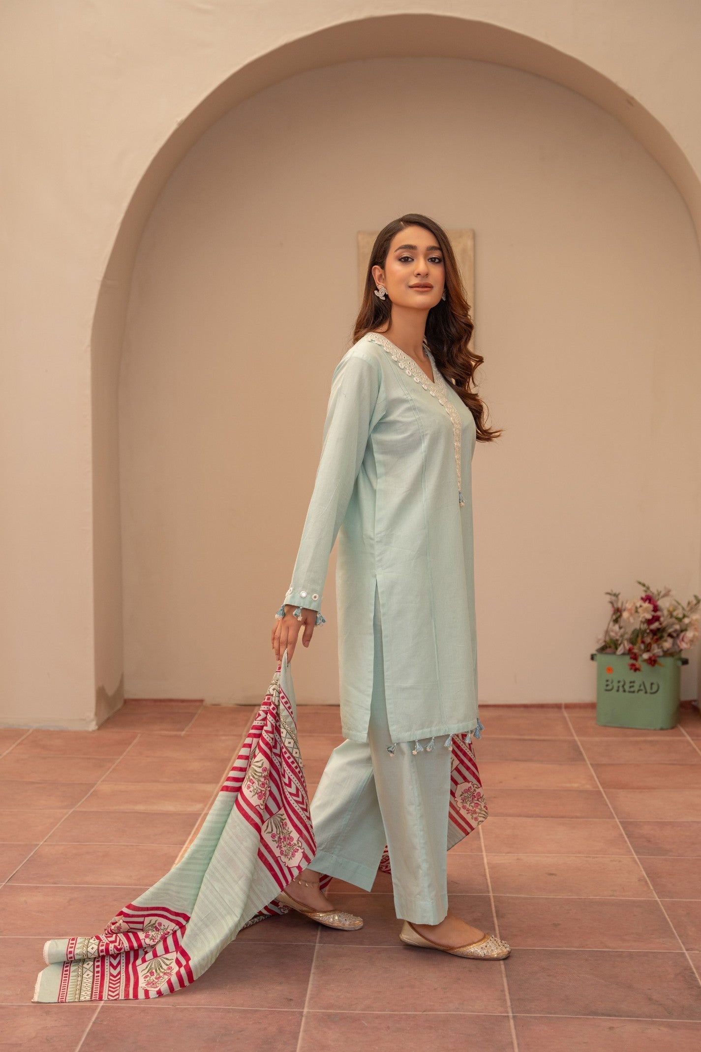 A soft mint canvas brought to life with intricate embroidery and delicate mirror work, creating a look that’s both timeless and on-trend. The straight-cut silhouette pairs effortlessly with matching trousers, while the digitally printed dupatta adds a bold touch of color and design. Subtle yet striking—perfect for making an impression without saying a word.