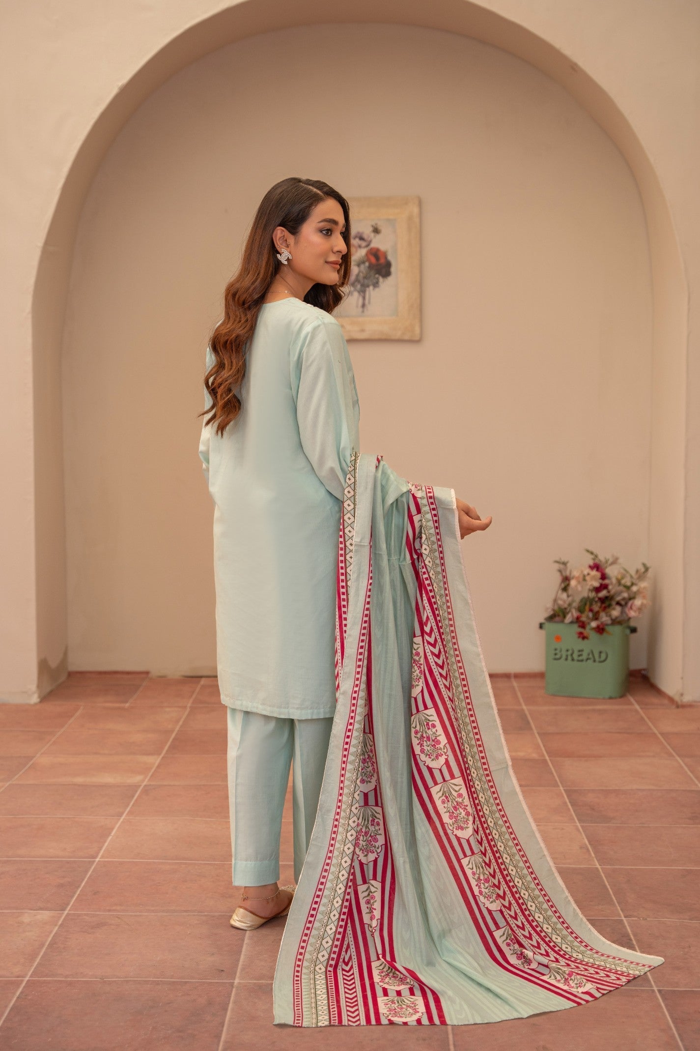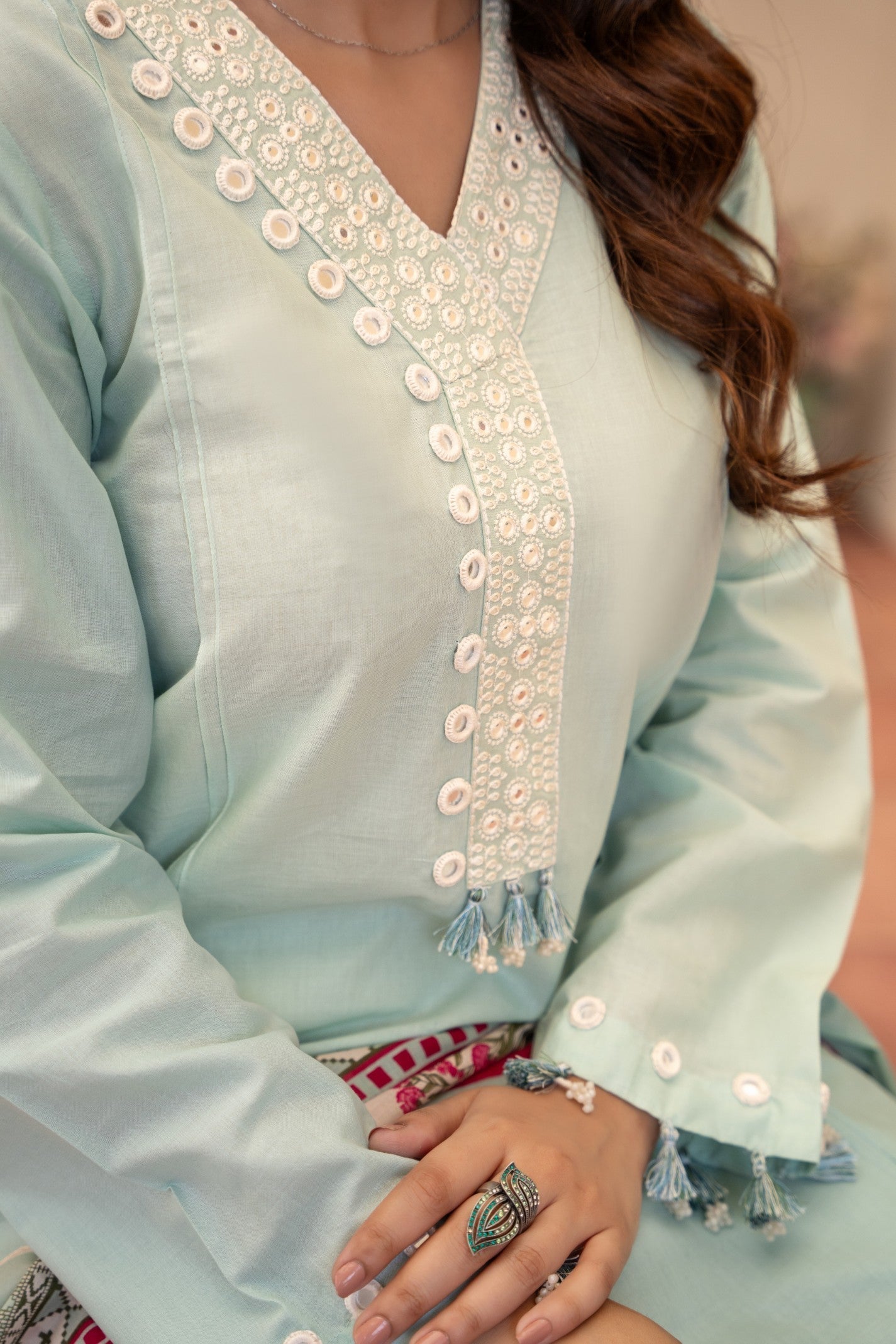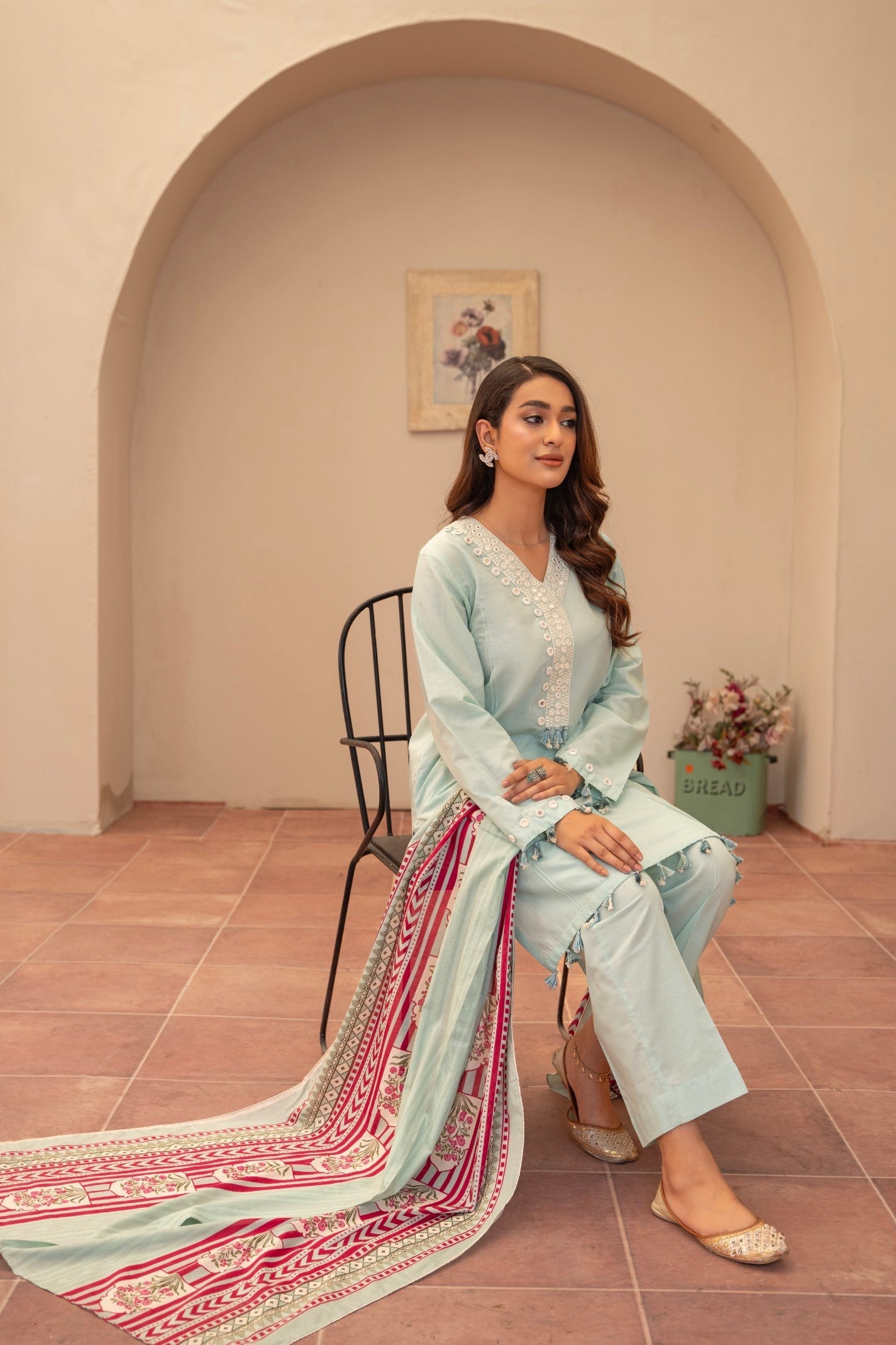 A soft mint canvas brought to life with intricate embroidery and delicate mirror work, creating a look that’s both timeless and on-trend. The straight-cut silhouette pairs effortlessly with matching trousers, while the digitally printed dupatta adds a bold touch of color and design. Subtle yet striking—perfect for making an impression without saying a word.