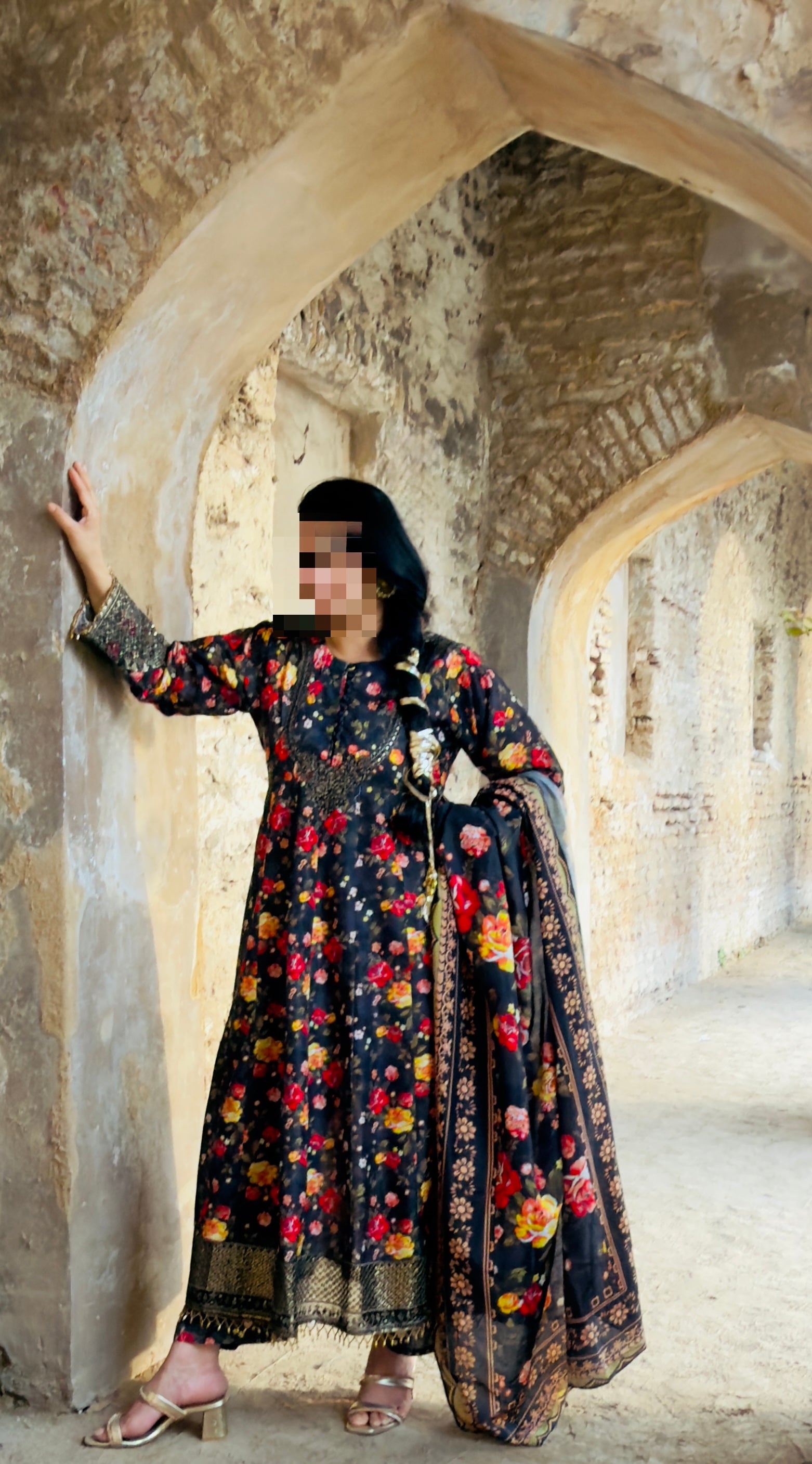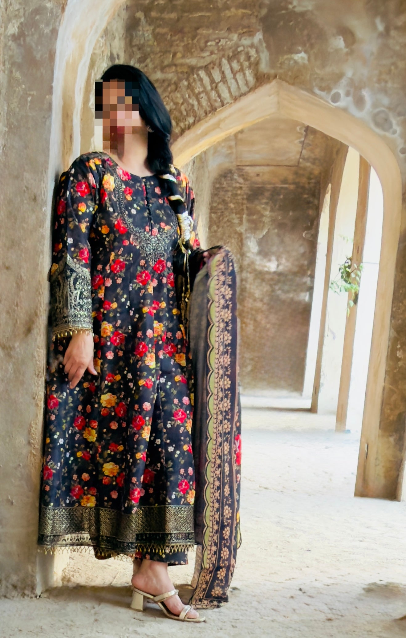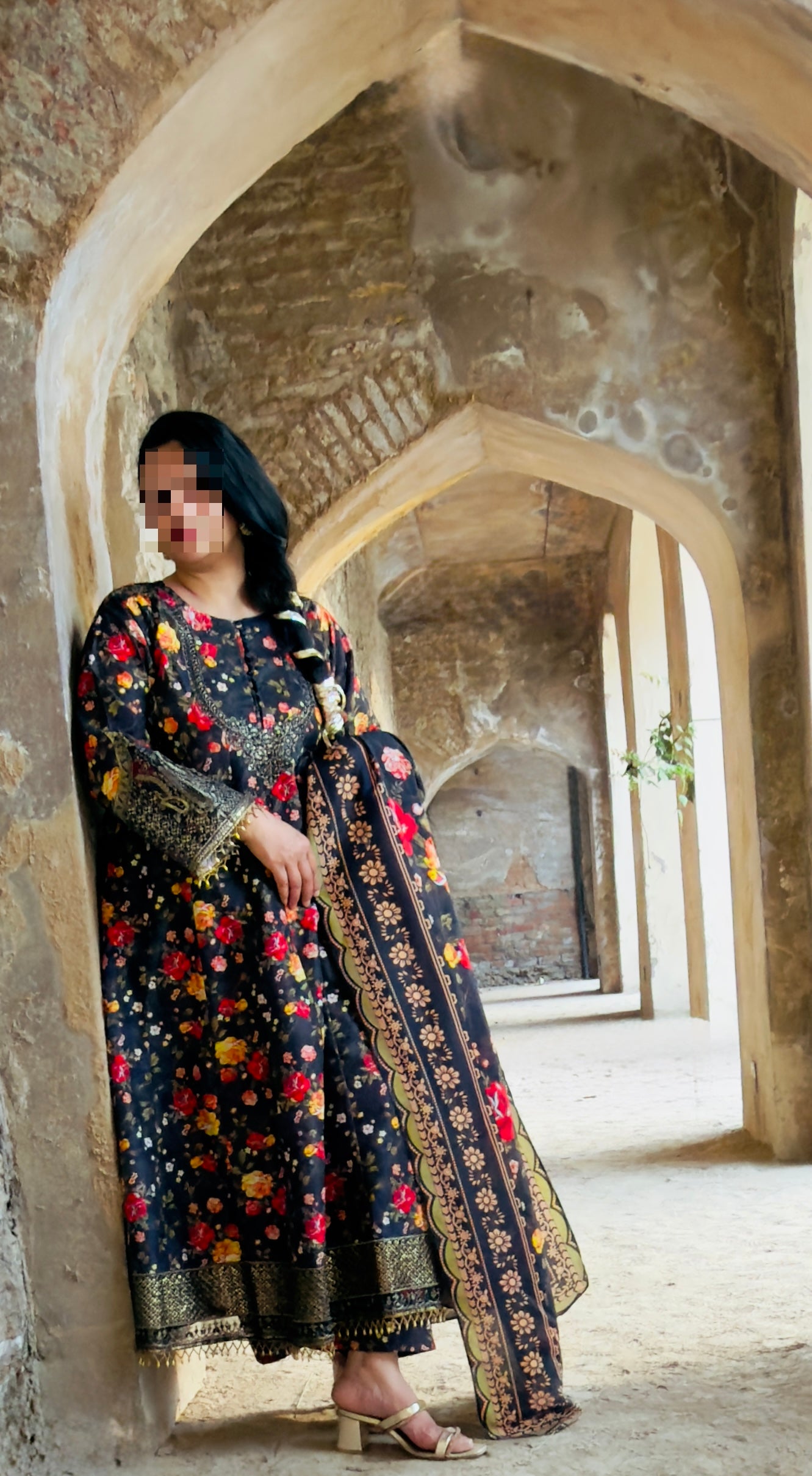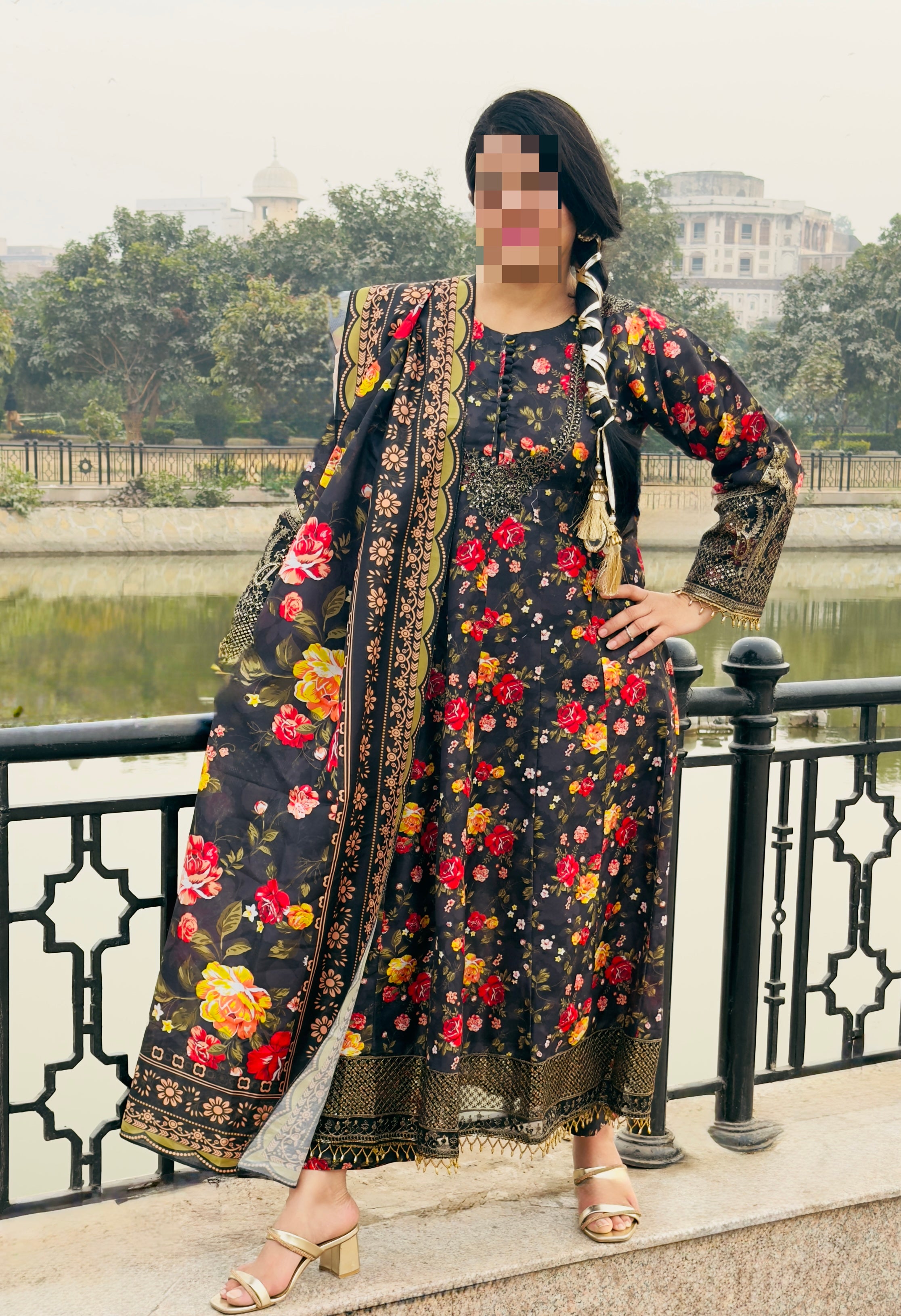 This 3-piece embroidered corduroy dress comes in a beautiful long frock style, featuring rich florals and detailed neckline embroidery.