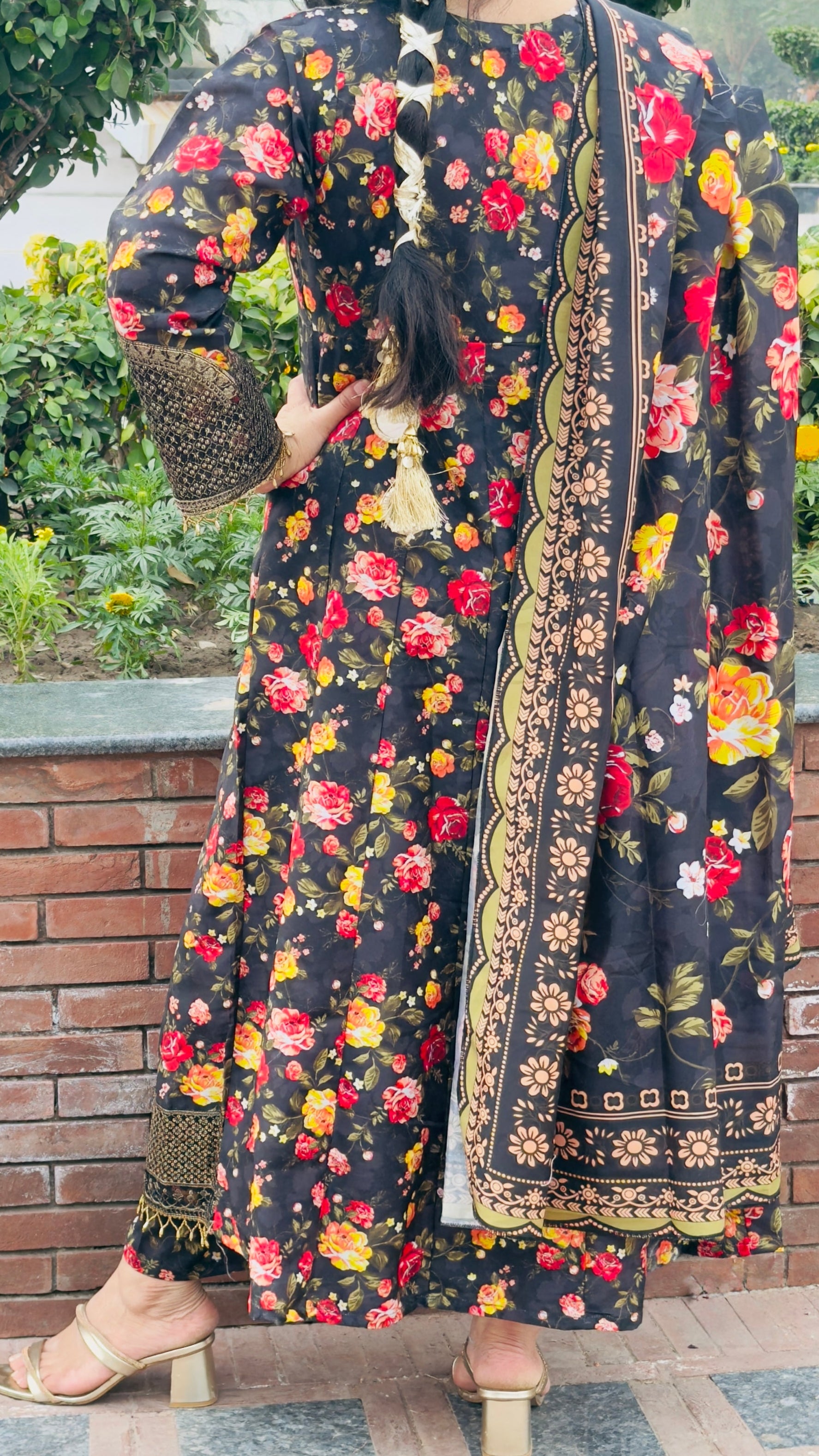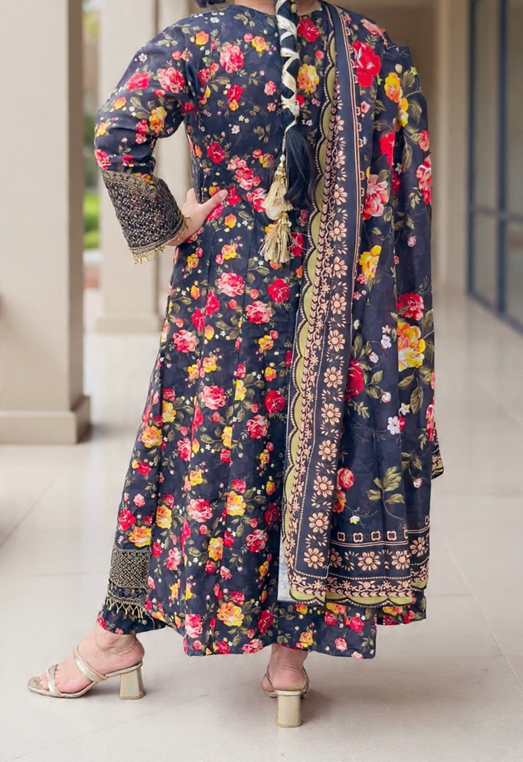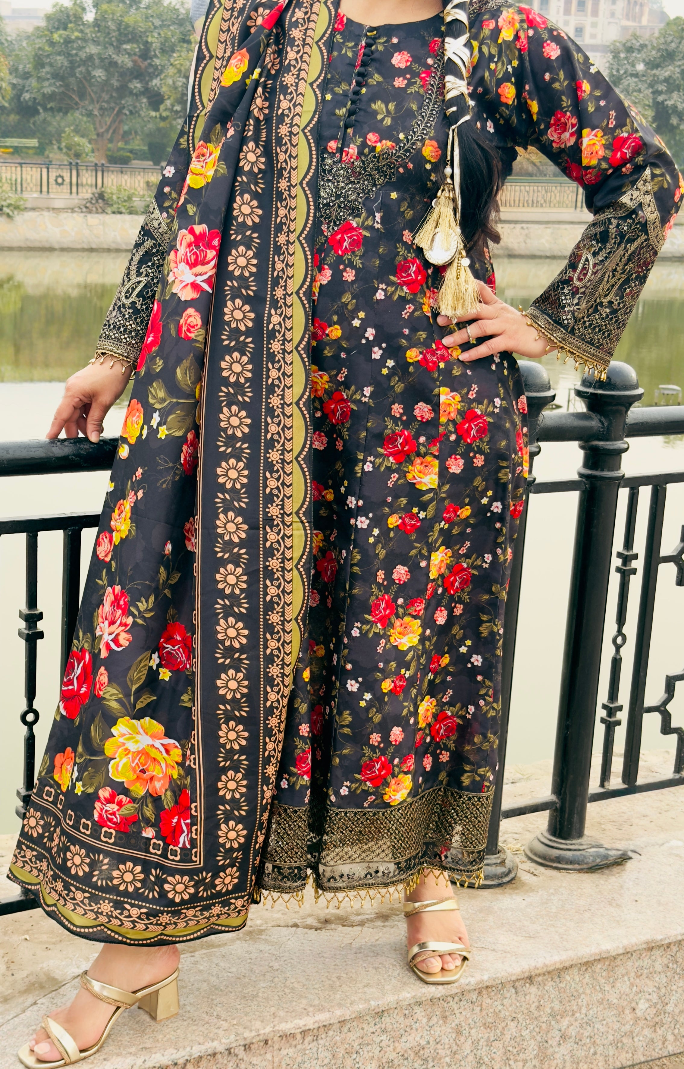 This 3-piece embroidered corduroy dress comes in a beautiful long frock style, featuring rich florals and detailed neckline embroidery.