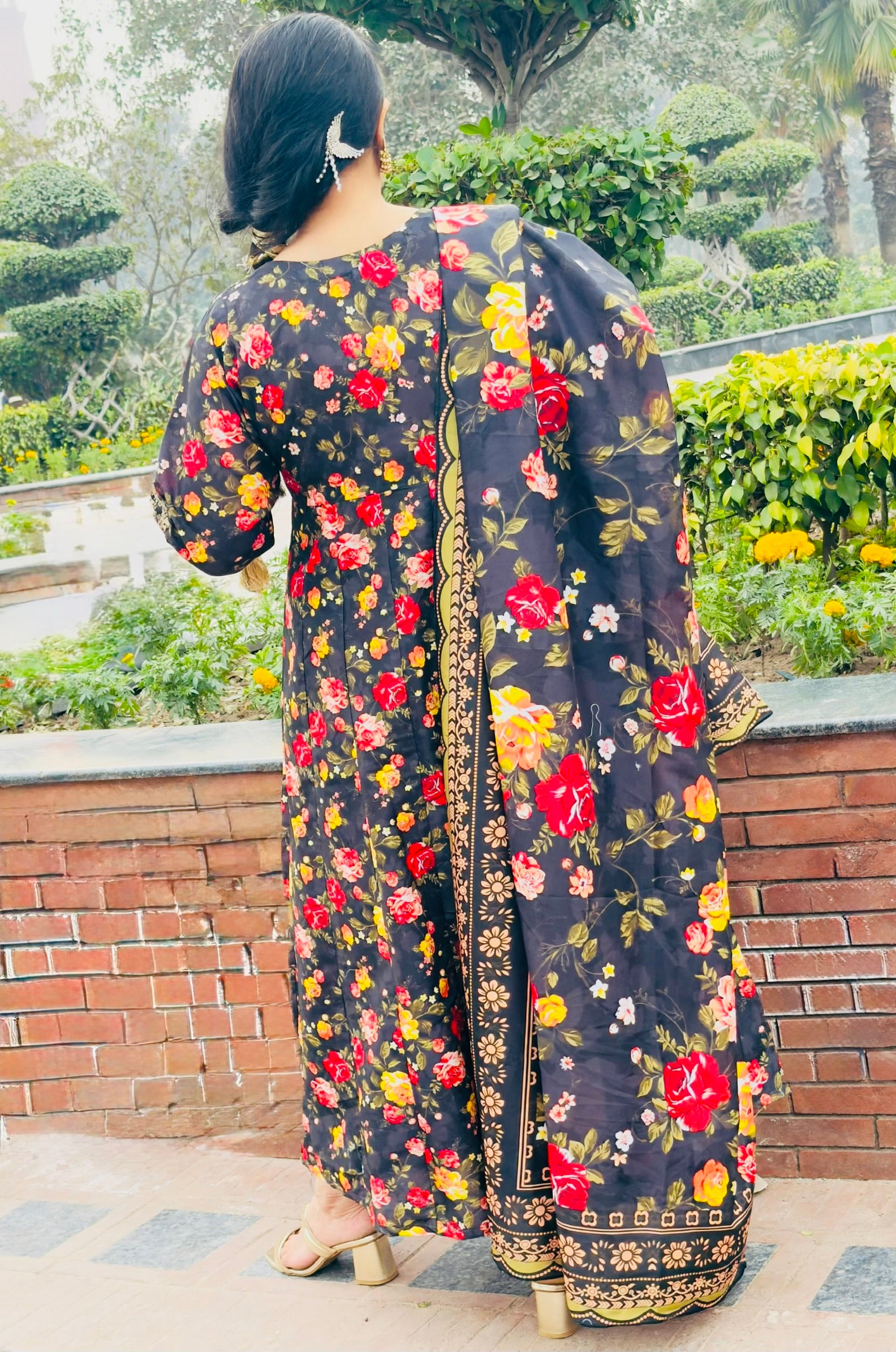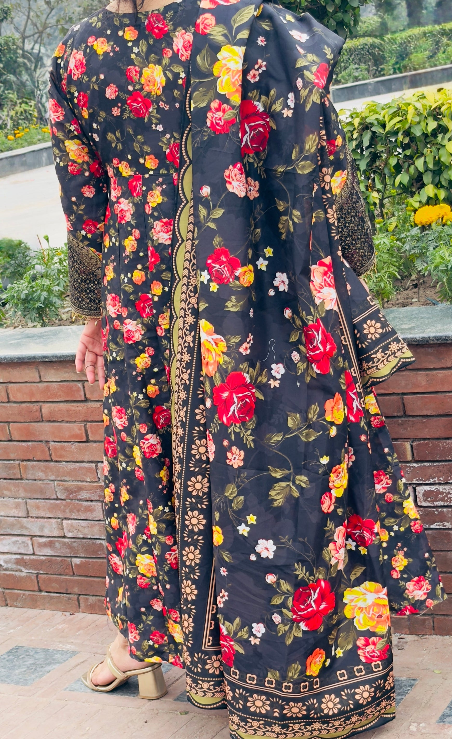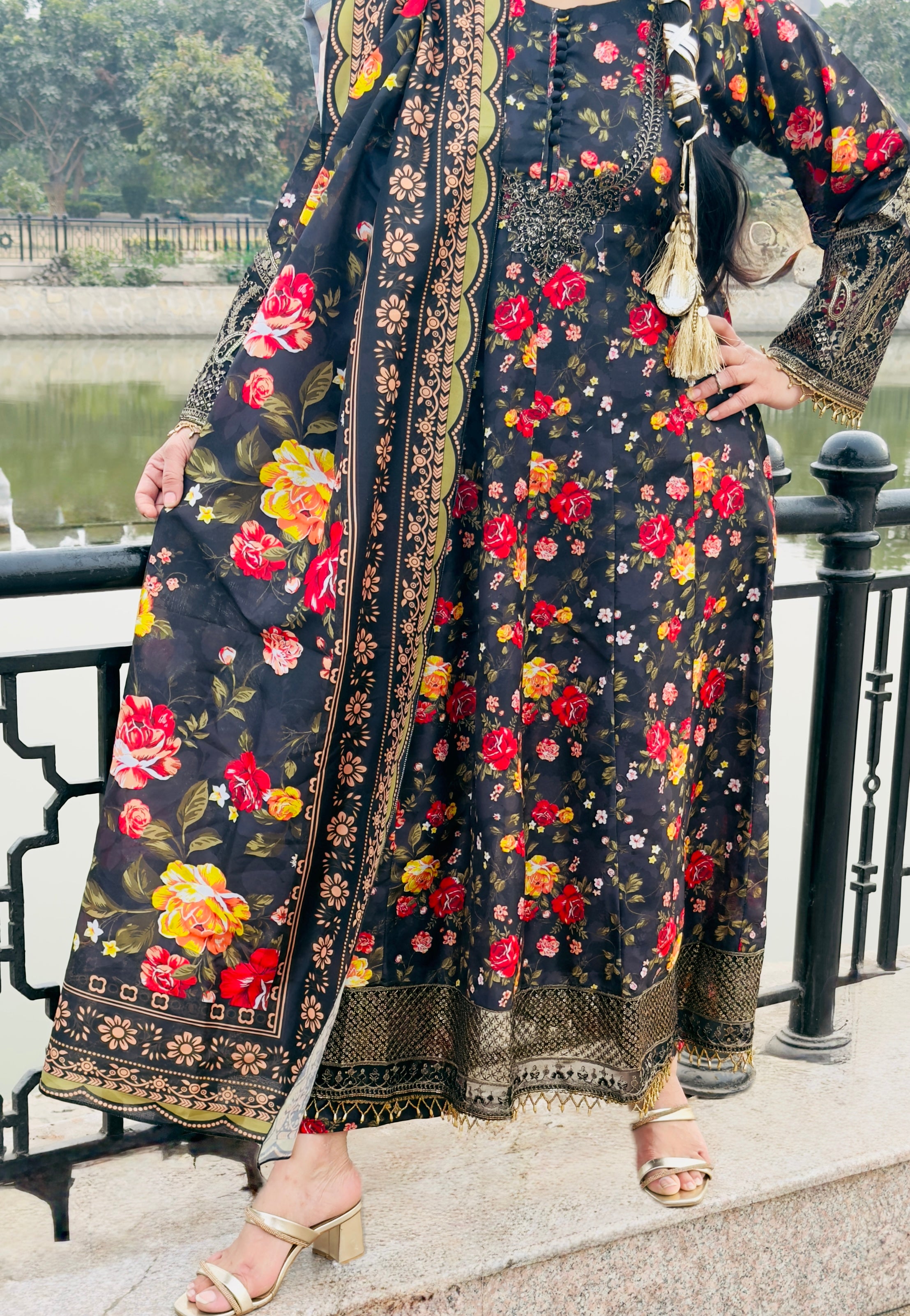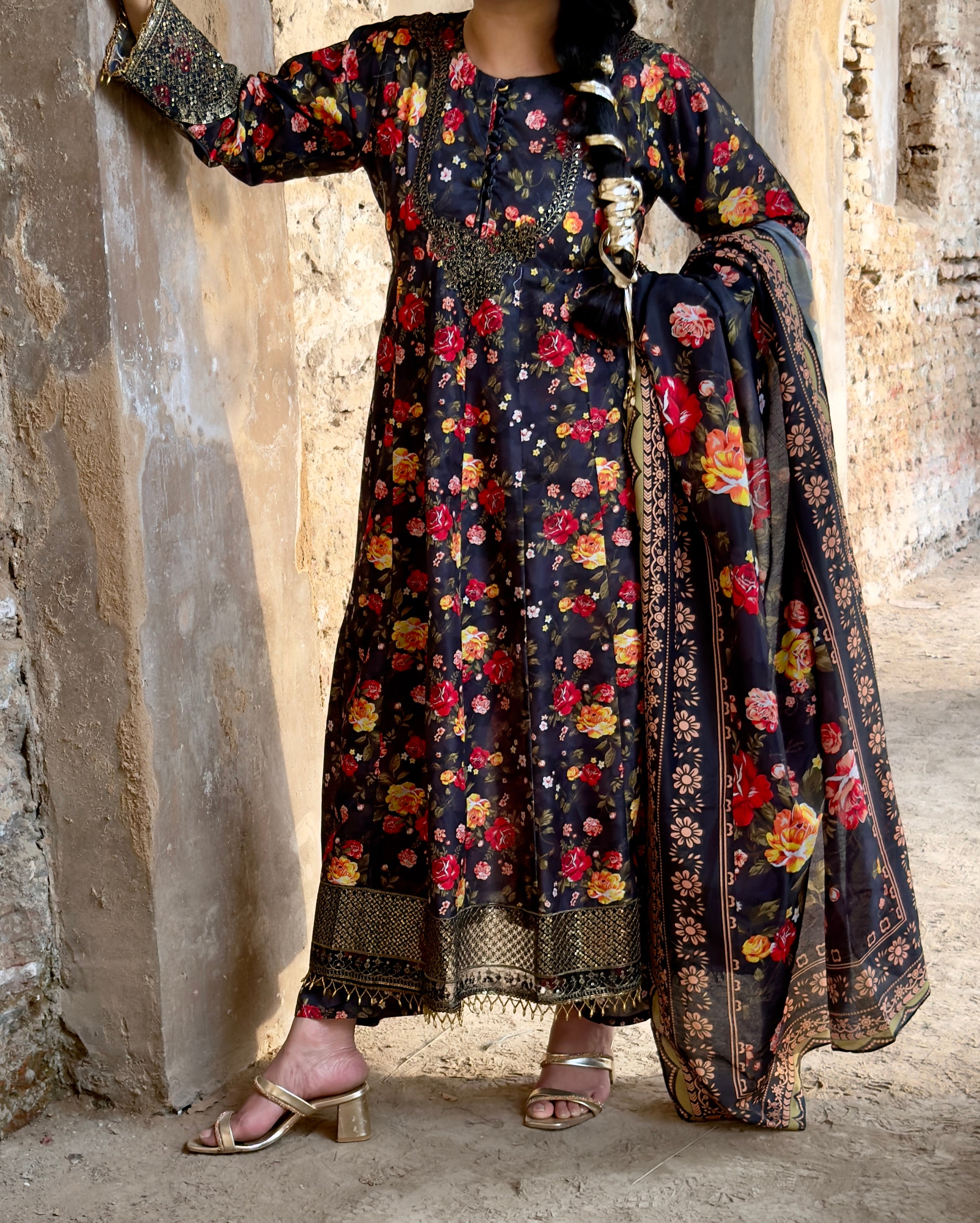 This 3-piece embroidered corduroy dress comes in a beautiful long frock style, featuring rich florals and detailed neckline embroidery.