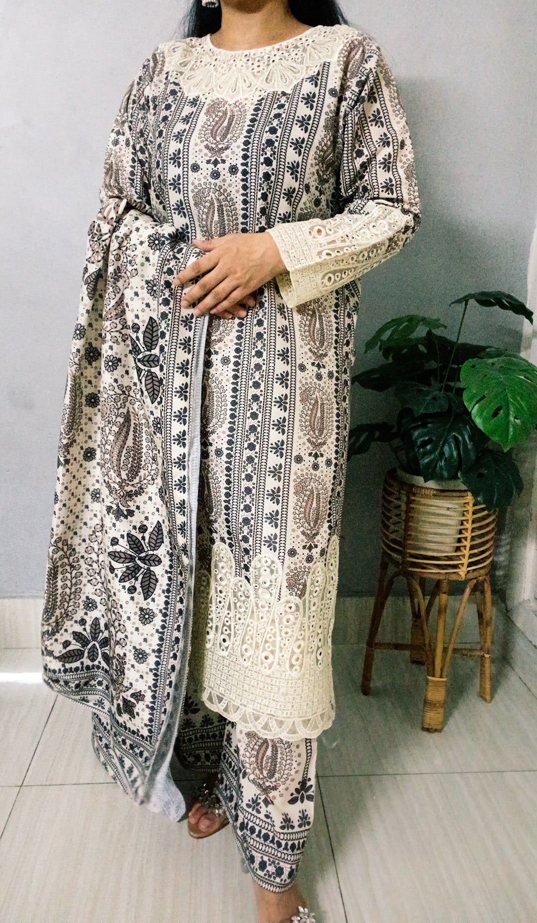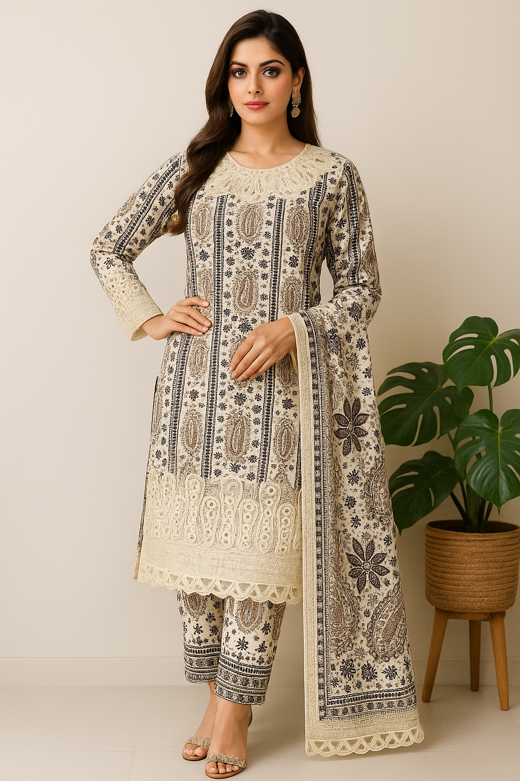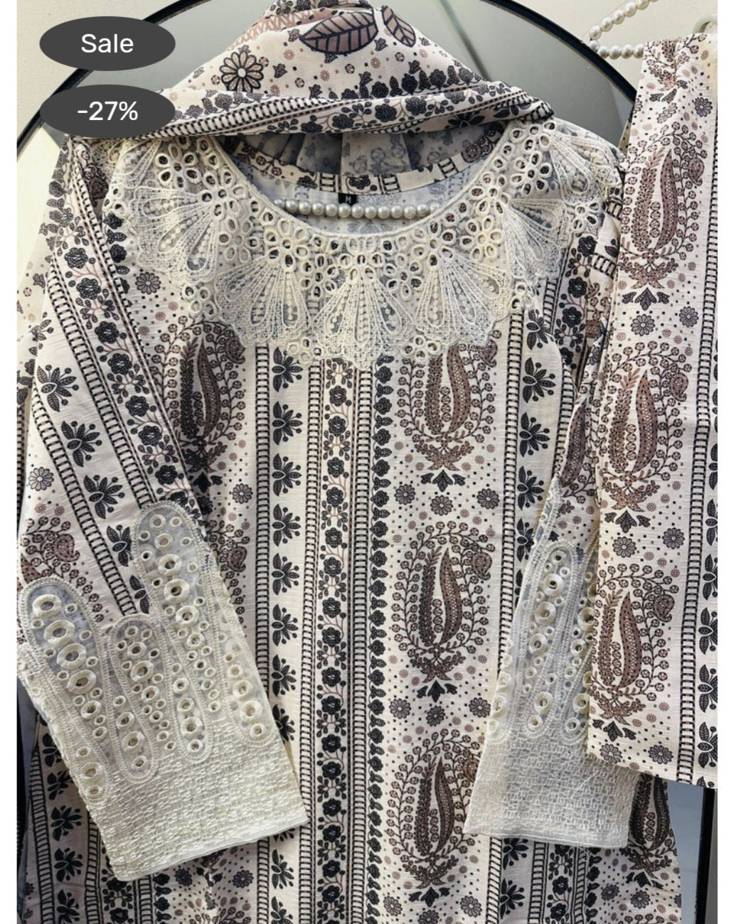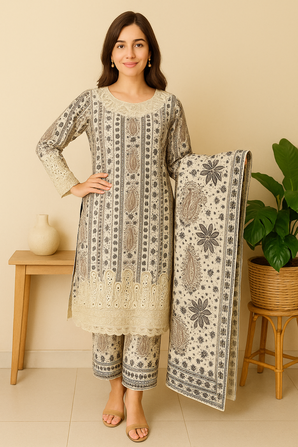 3 piece stiched dress Effortless elegance in corduroy ✨ Soft beige hues, detailed embroidery, and timeless comfort...