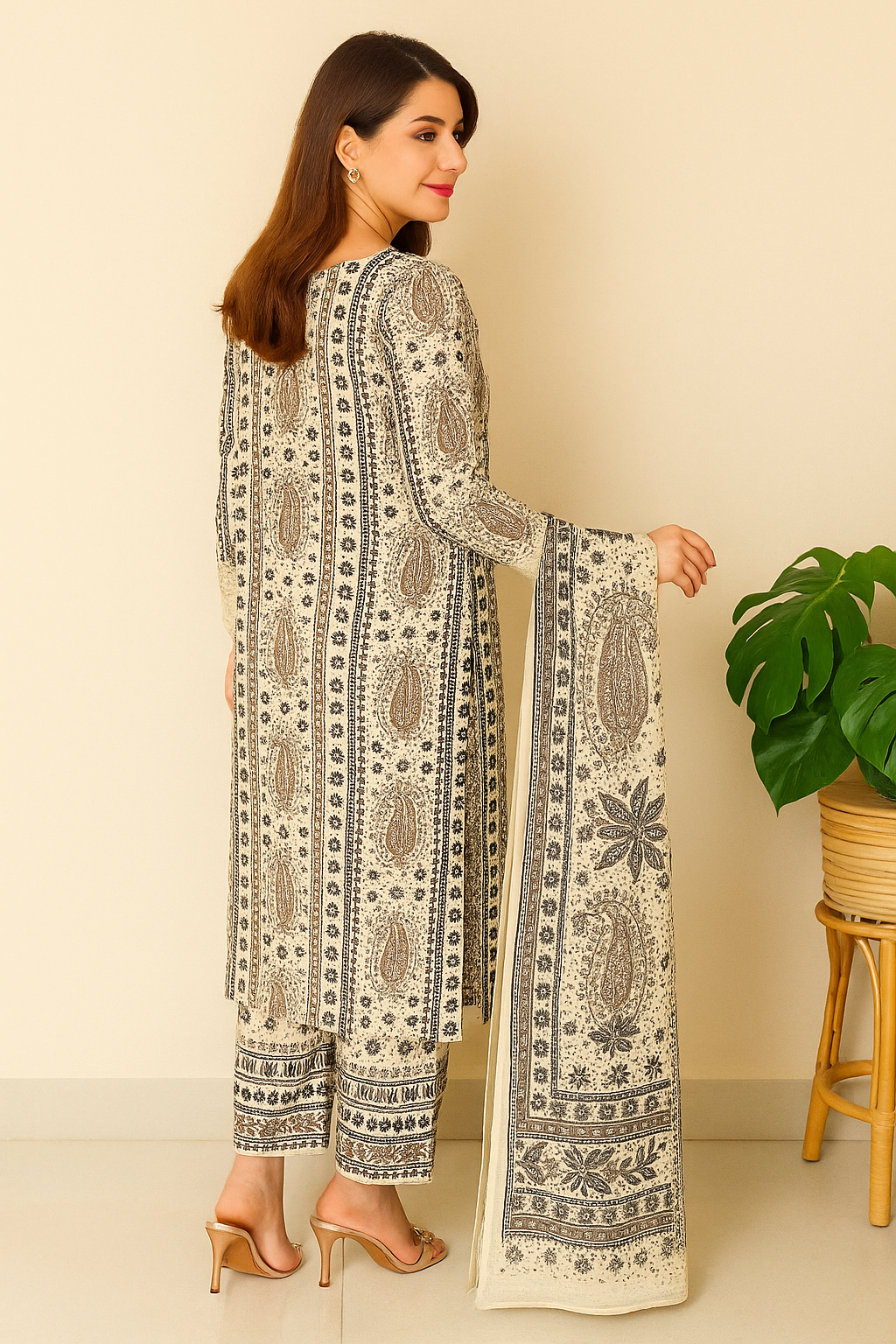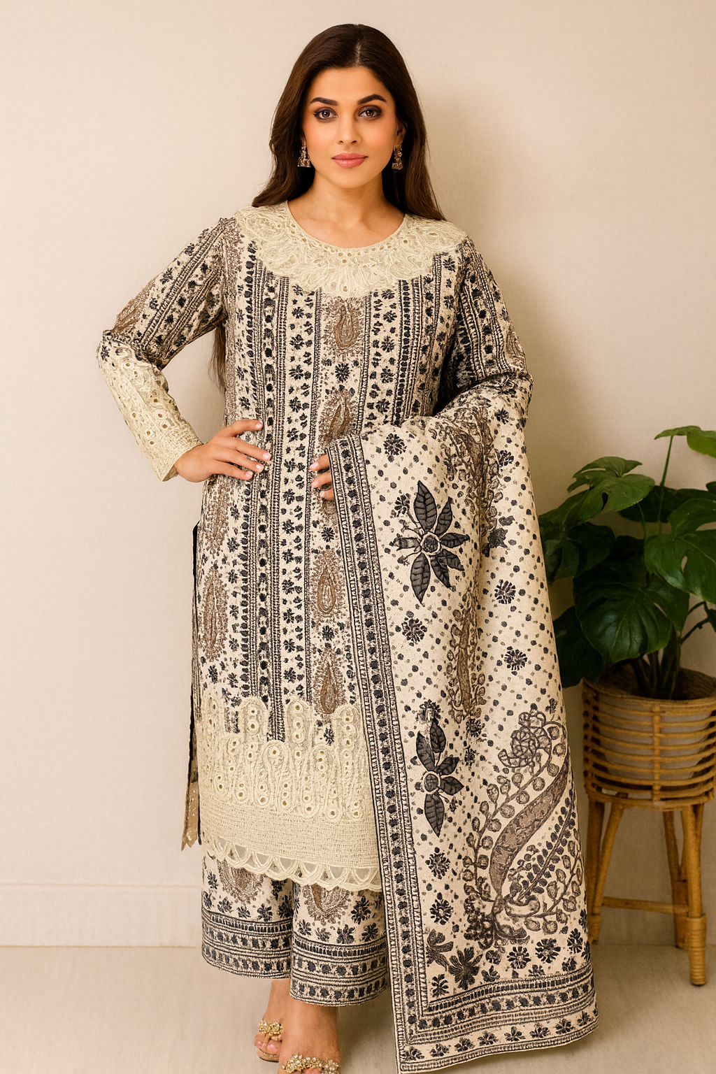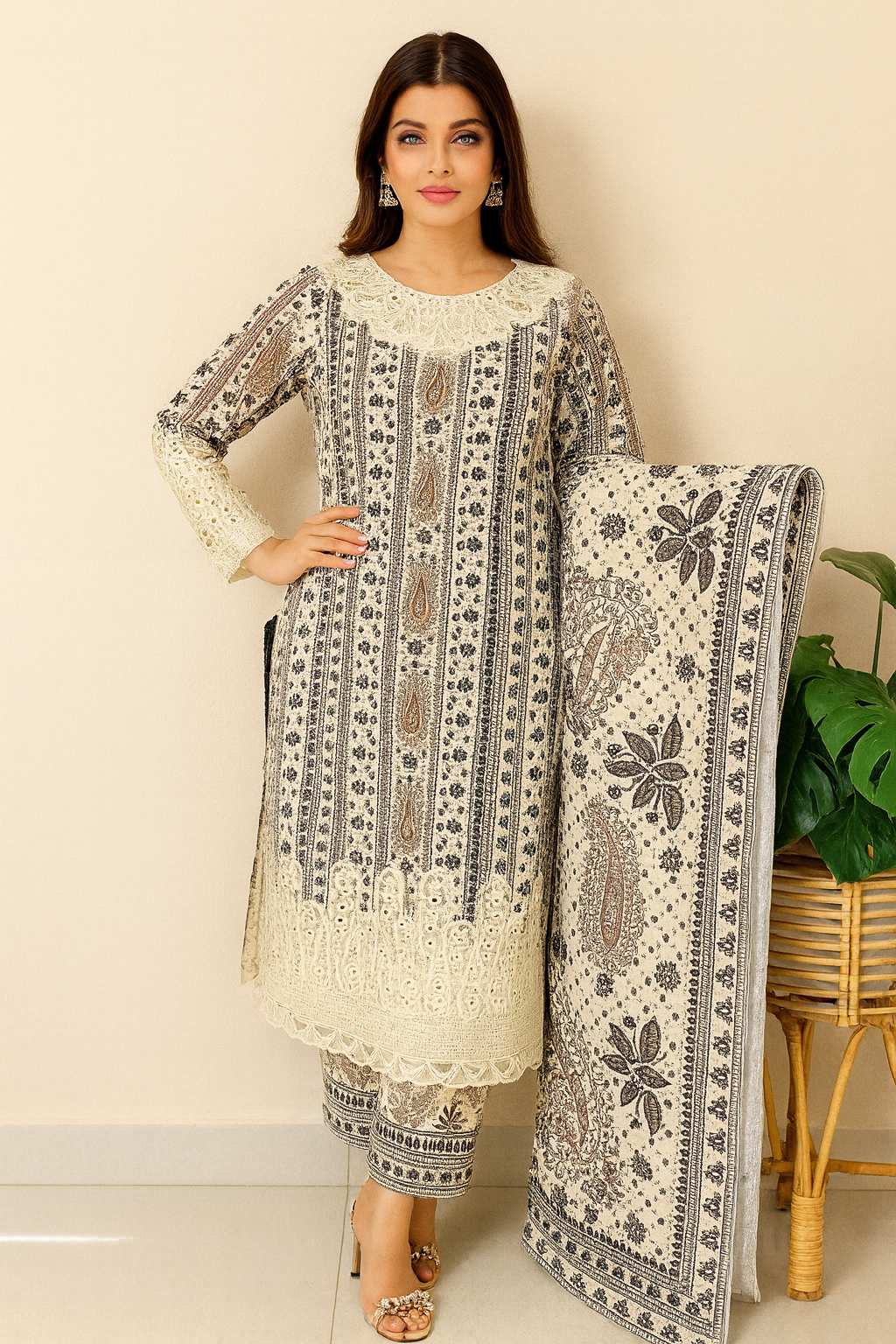 3 piece stiched dress Effortless elegance in corduroy ✨ Soft beige hues, detailed embroidery, and timeless comfort...