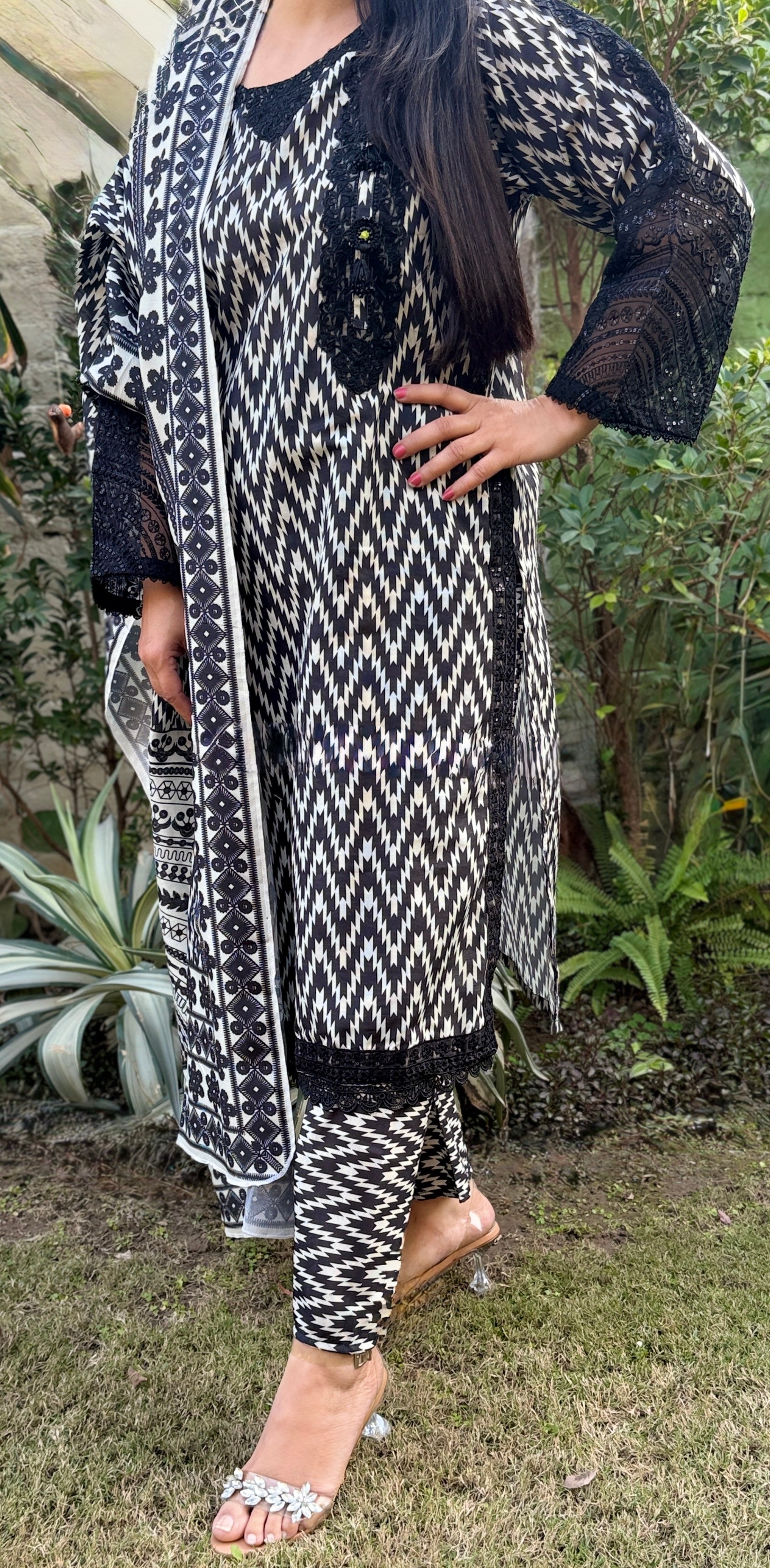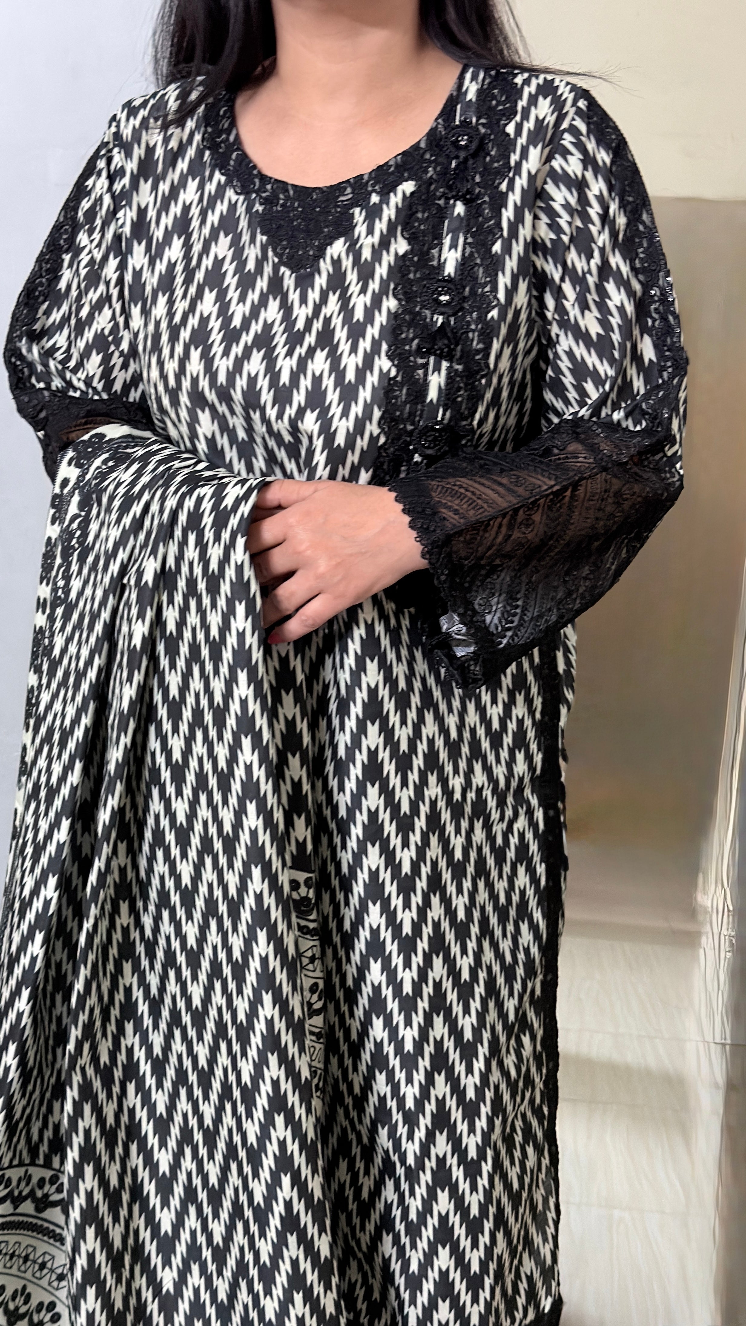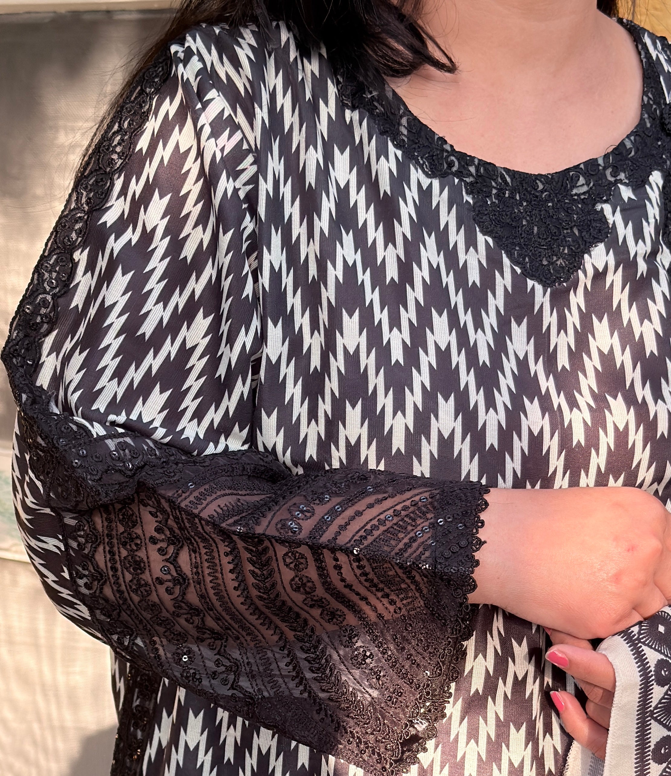 This 3-piece embroidered corduroy dress comes in a beautiful long style, featuring rich and detailed neckline embroidery.