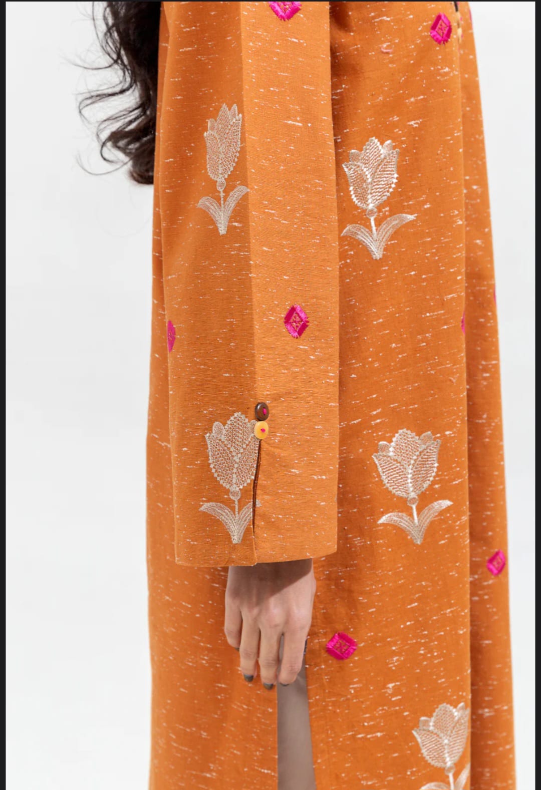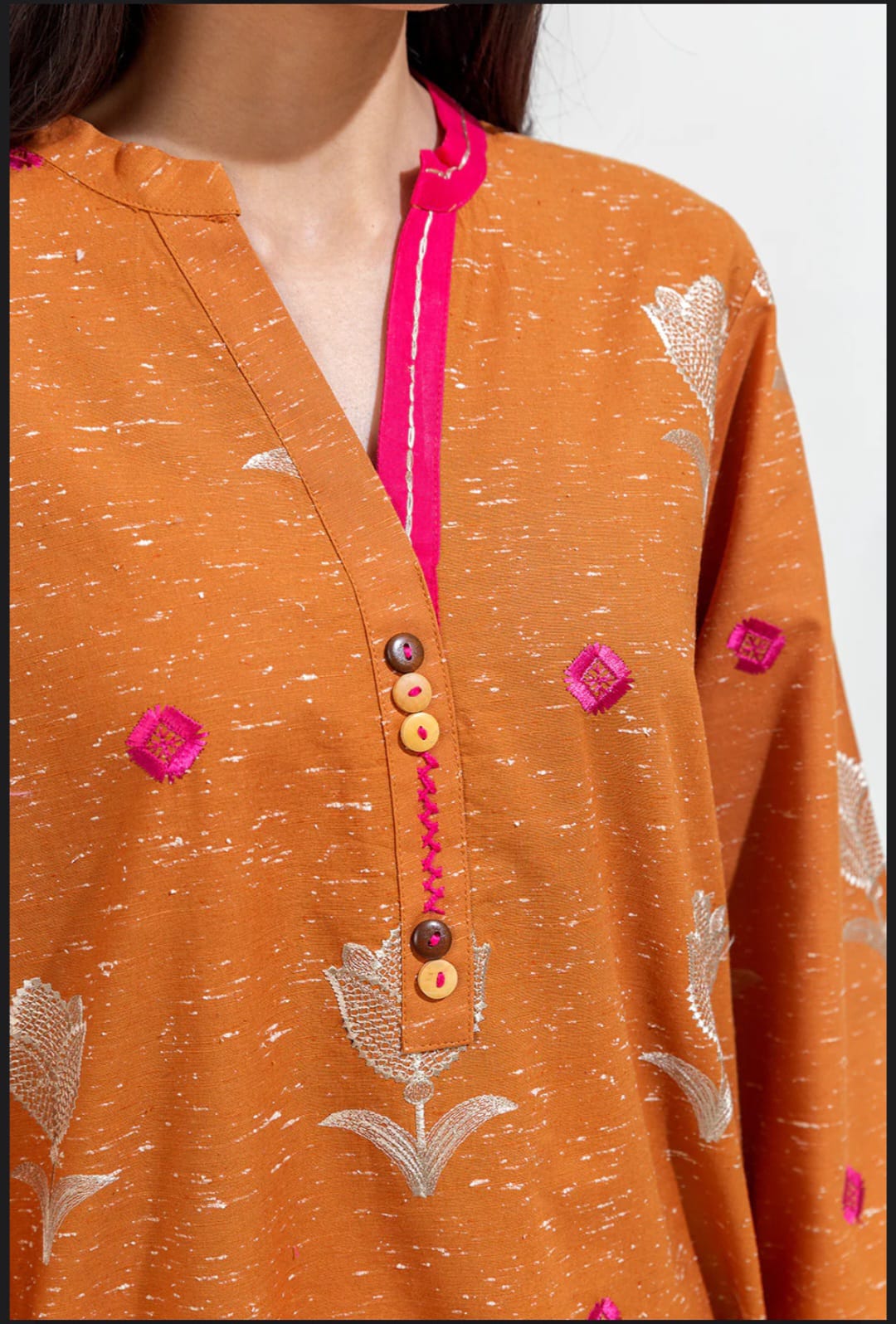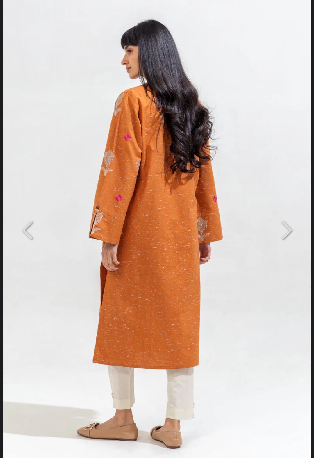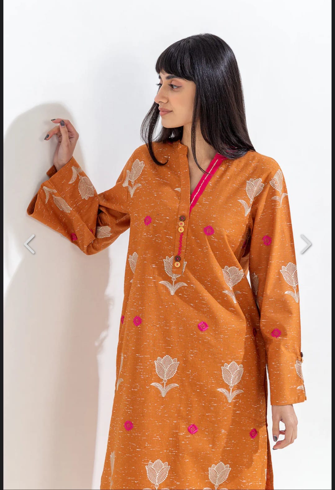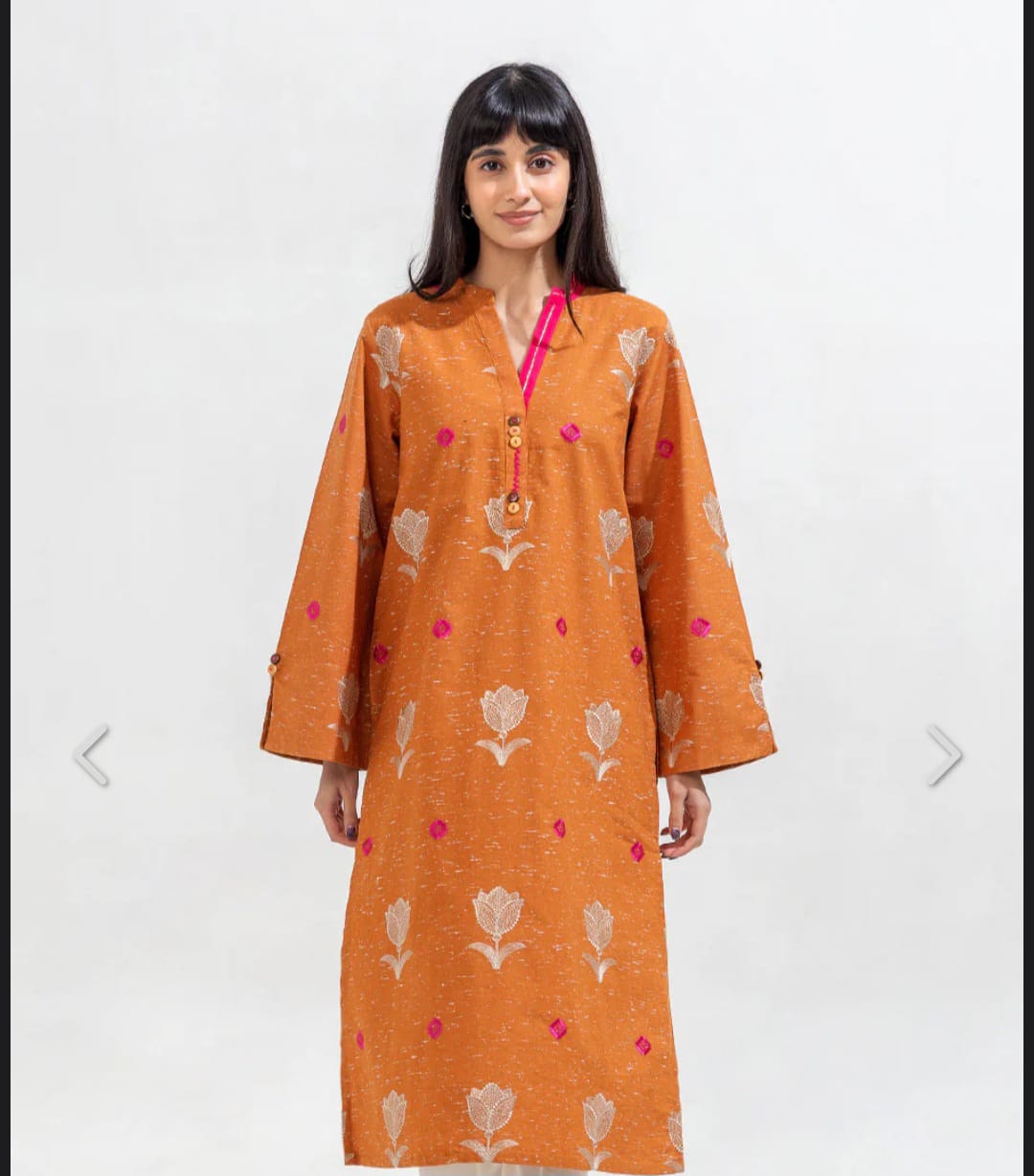 A chic embroidered kurta set featuring delicate floral motifs and subtle contrast accents. Styled with a straight cut, buttoned neckline, and relaxed sleeves, it’s a versatile pick for everyday elegance and effortless charm.