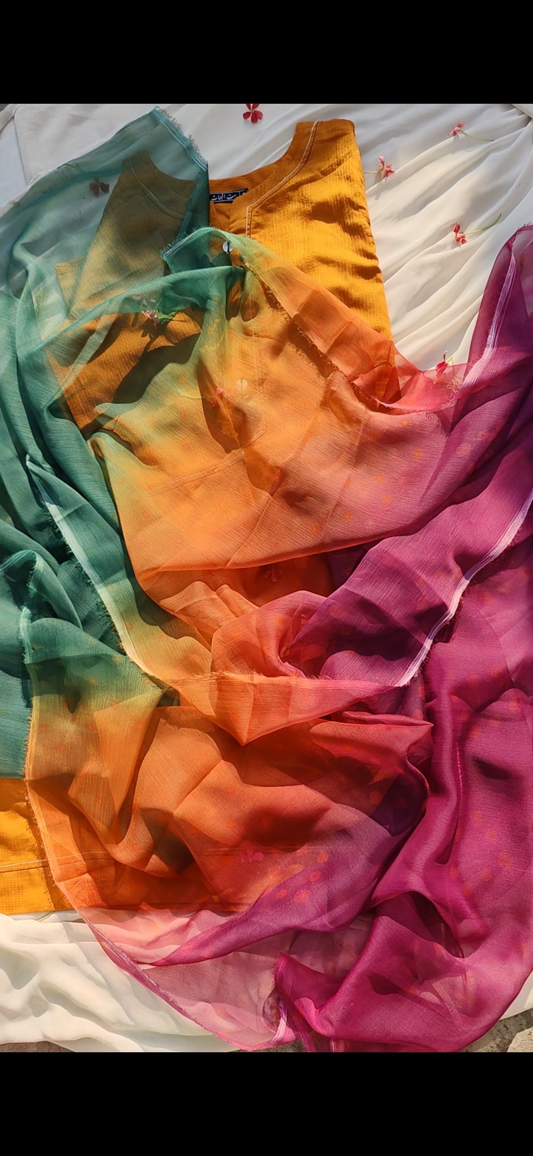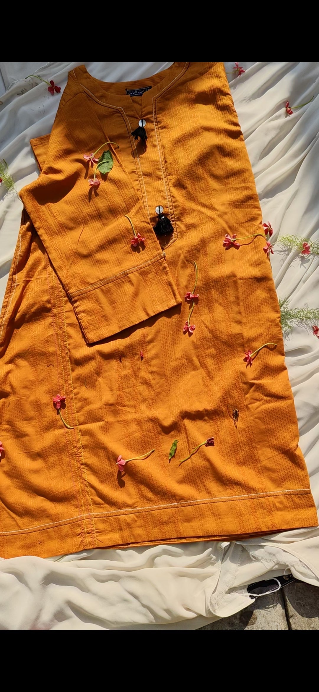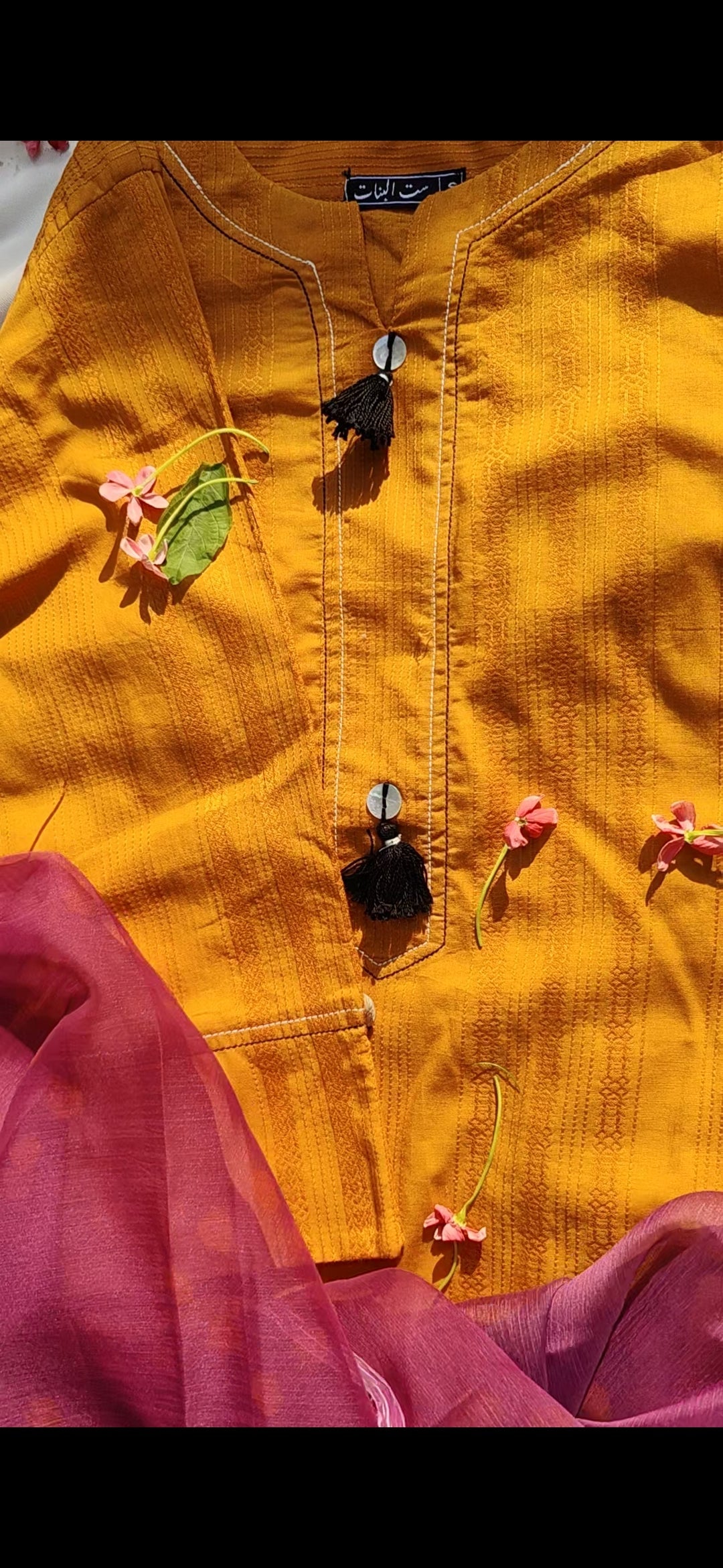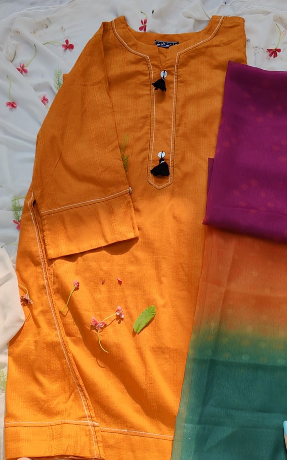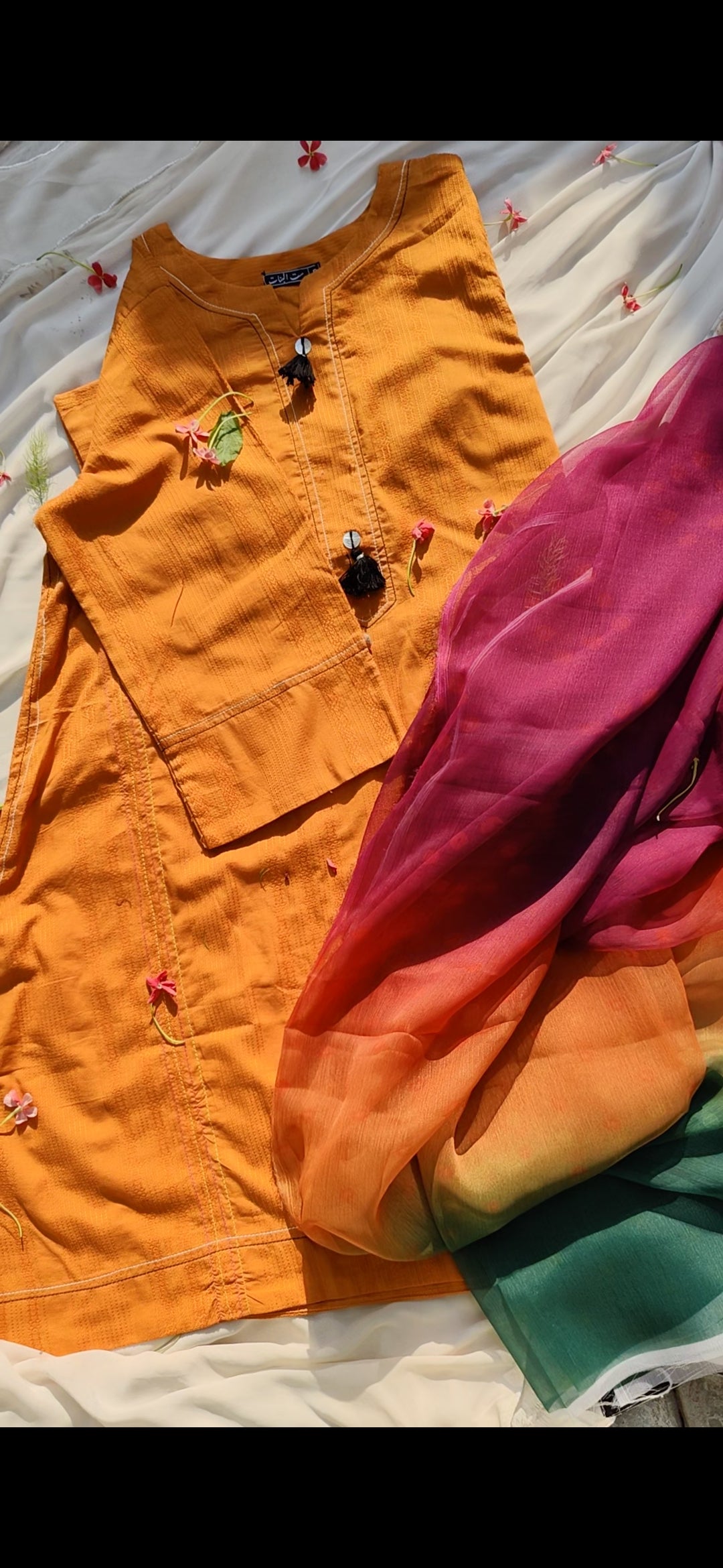 Add a burst of sunshine to your wardrobe with this vibrant Mustard Orange 2-Piece Ensemble. The shirt features a textured cotton fabric and charming black tassel detailing on the neckline, offering a blend of minimal style and ethnic grace. Paired with a rich magenta dupatta and a gradient orange-to-bottle green lower, this outfit exudes festive elegance and everyday comfort. Perfect for summer lunches, casual gatherings, or festive daytime events.