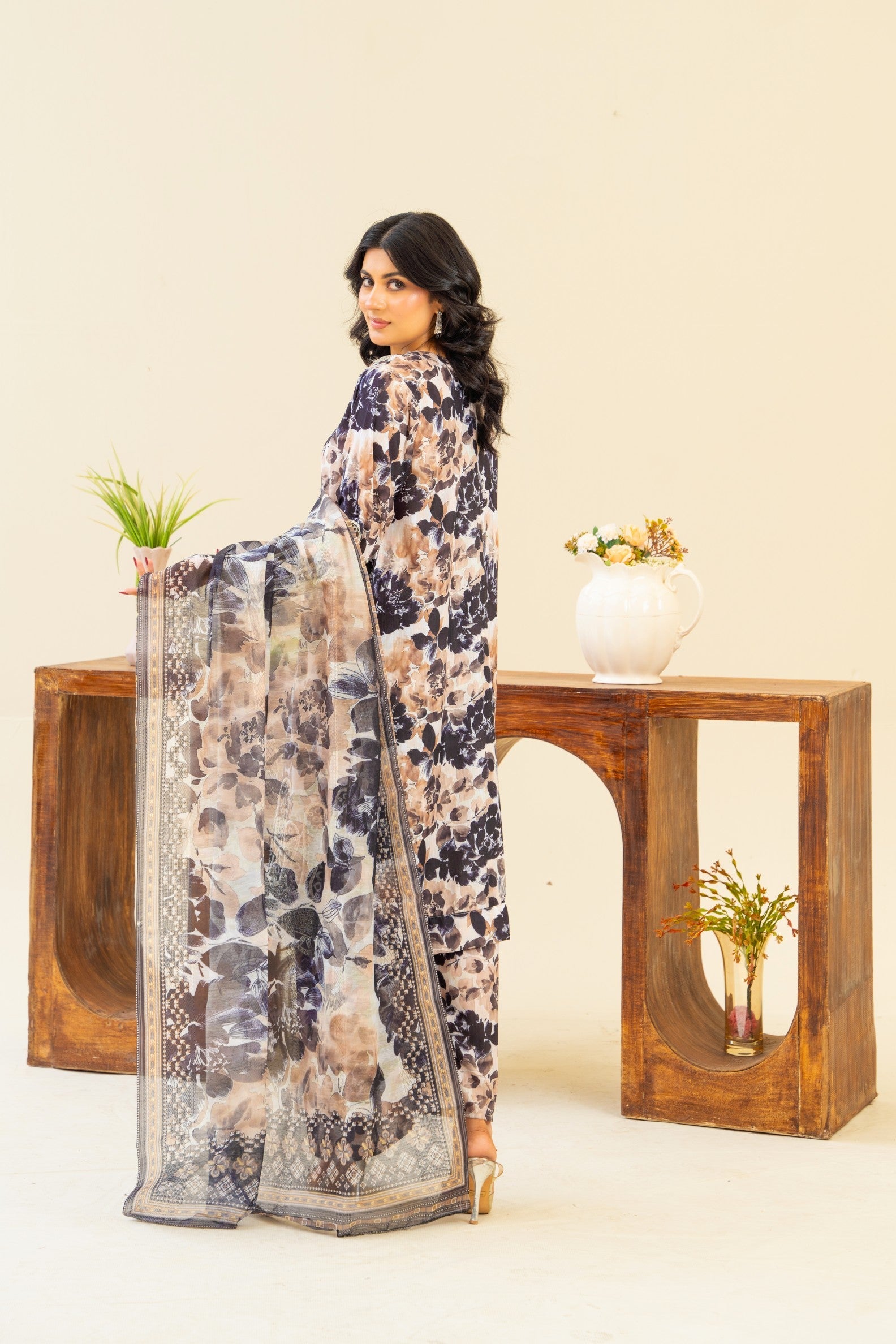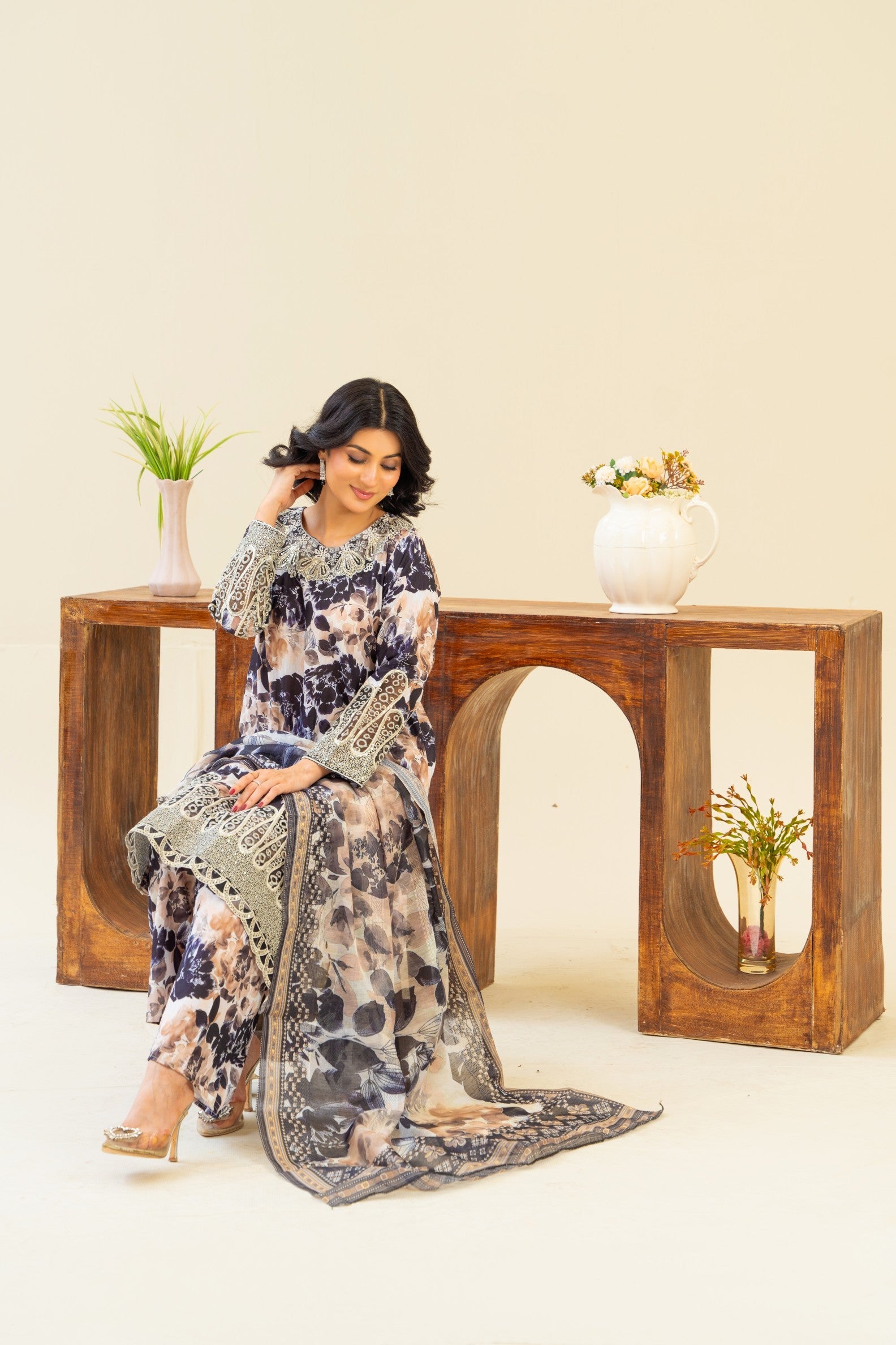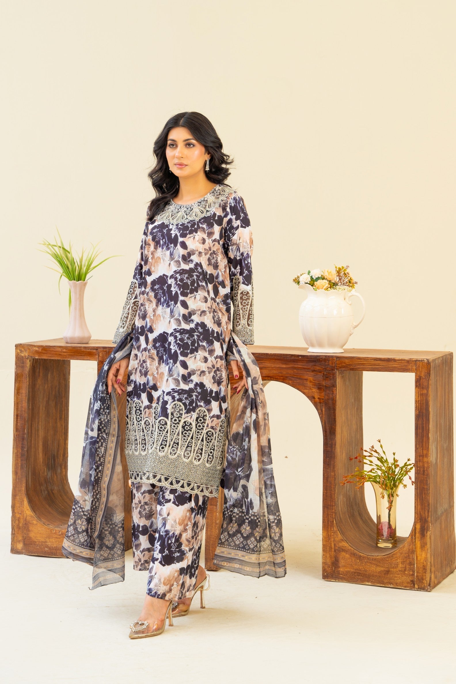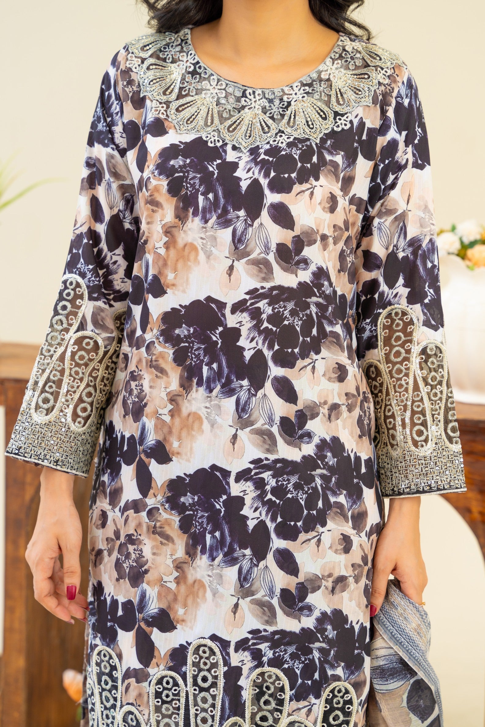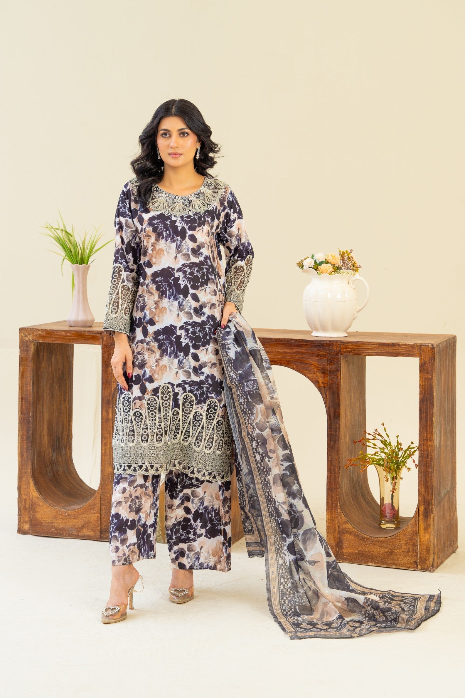 This elegant 3-piece embroidered corduroy outfit showcases timeless craftsmanship with intricate embroidery on the neckline, sleeves, and hemline. The rich texture of corduroy adds depth and warmth, while the detailed threadwork enhances its refined charm. Paired with matching trousers and a coordinating shawl, this ensemble blends comfort with sophistication — perfect for elevating your winter style with understated grace.