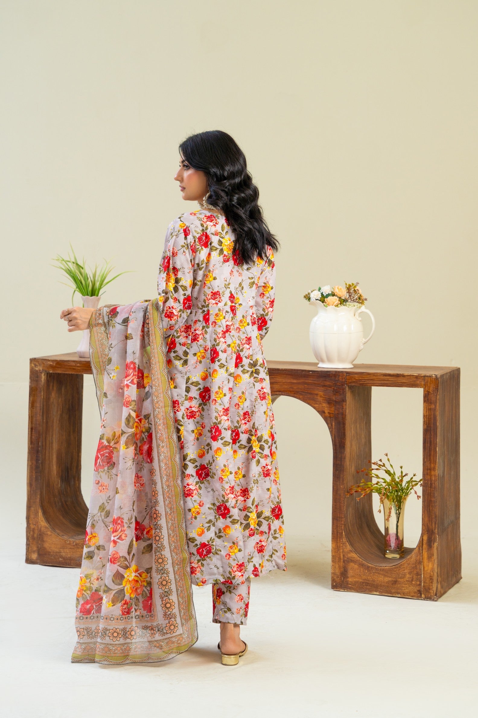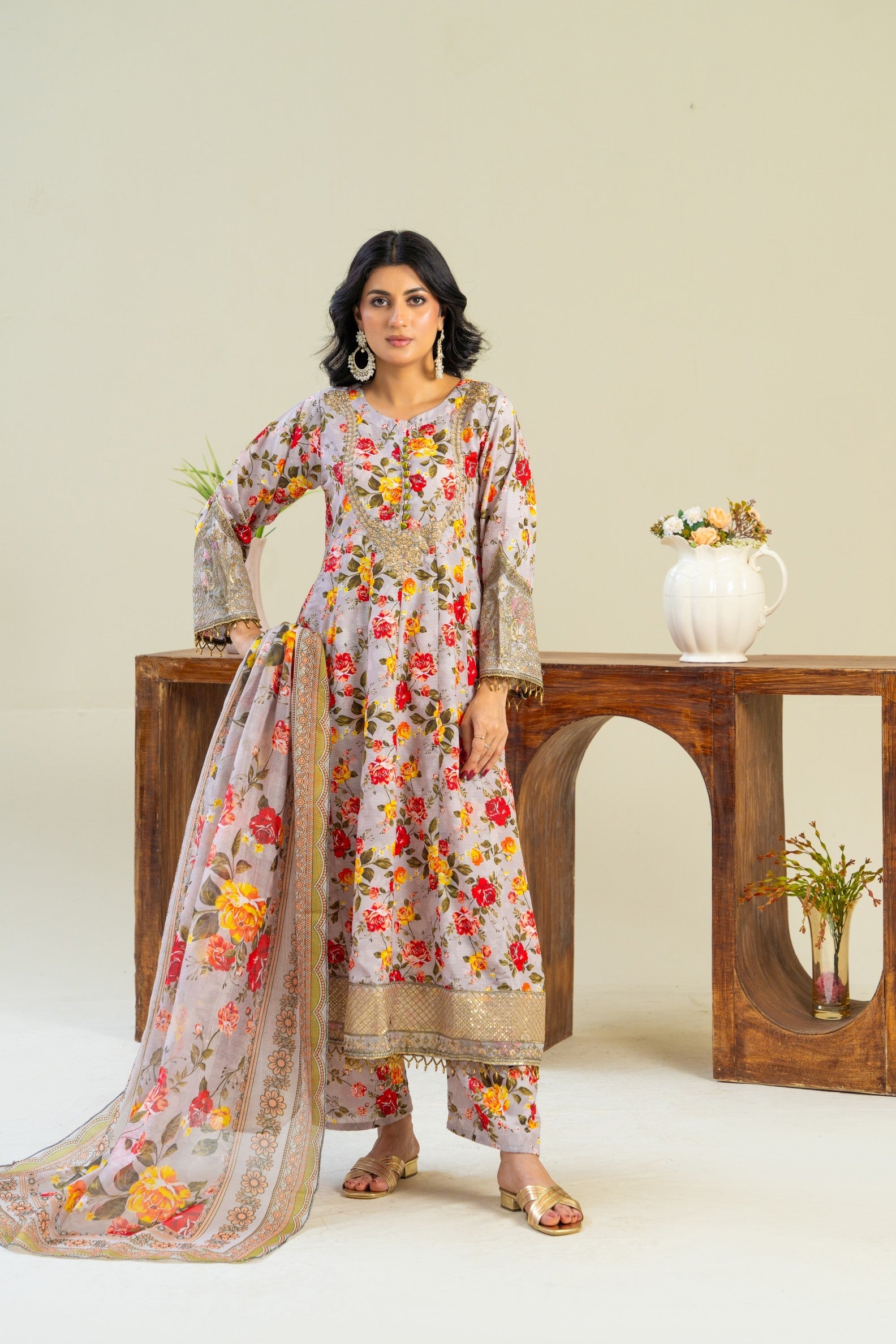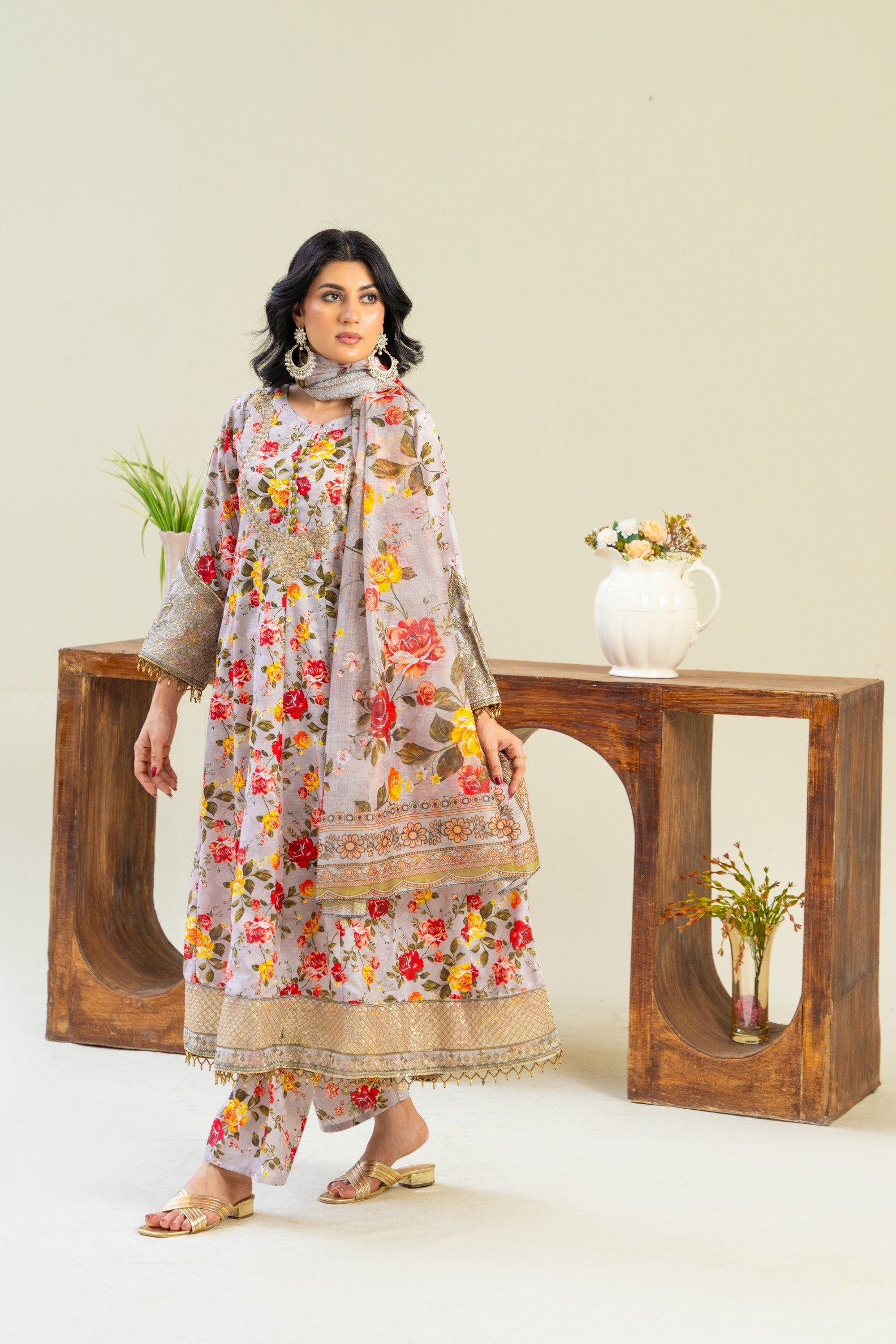 A beautifully flowy Anarkali frock, featuring a rich floral print that blends tradition with charm. The design is thoughtfully accented with EMBRIODERY detailing on the hemline and sleeve ends, adding just the right touch of texture. Delicate embriodery adorns the neckline and sleeve hems, offering a graceful finish. Paired with a vibrant manaar dupatta, this ensemble is ideal for daytime gatherings and effortless festive style.