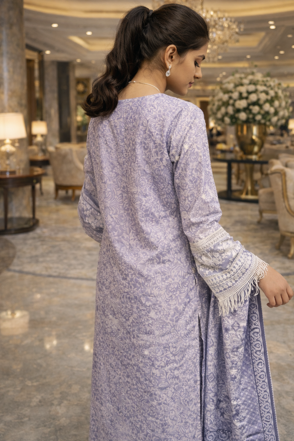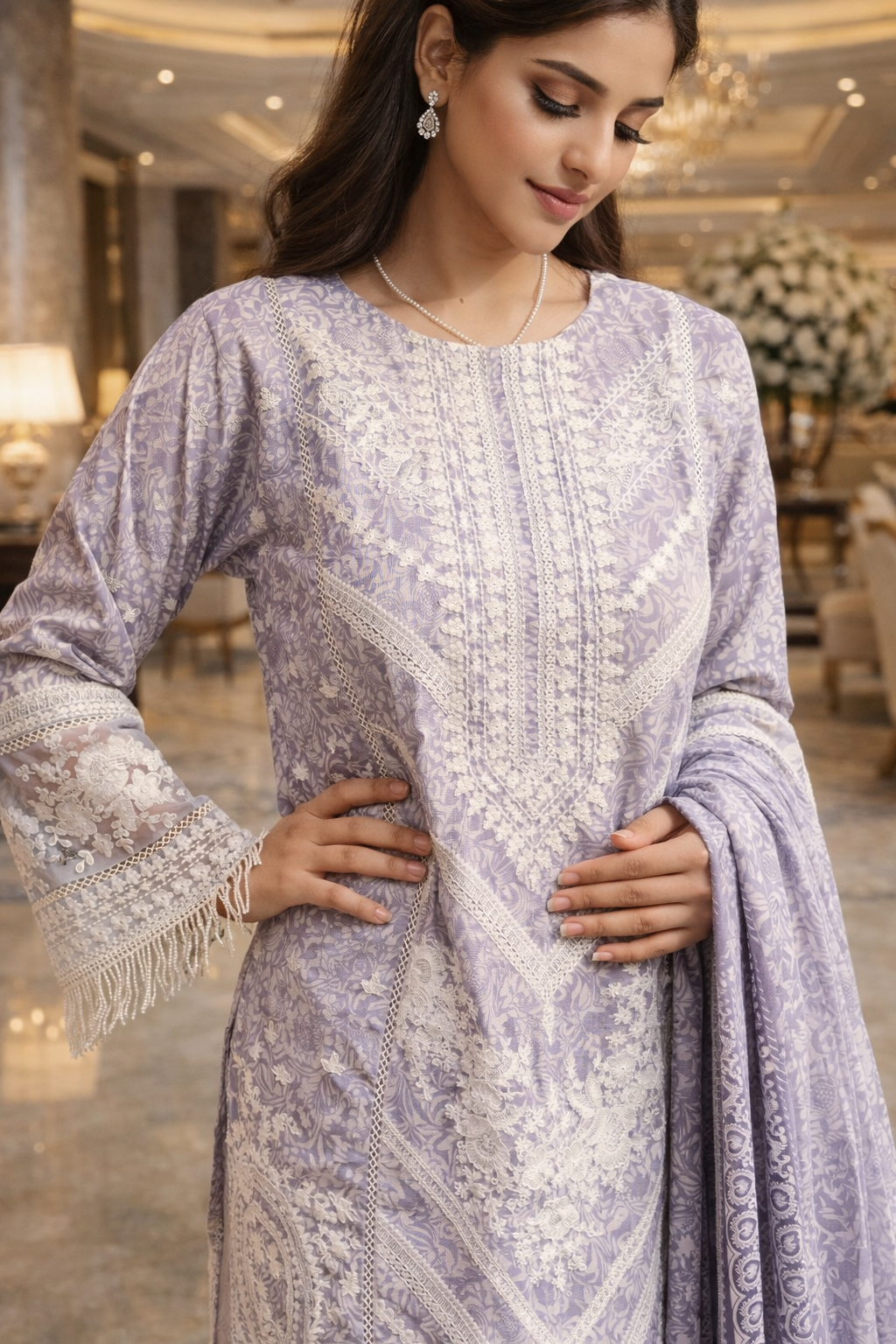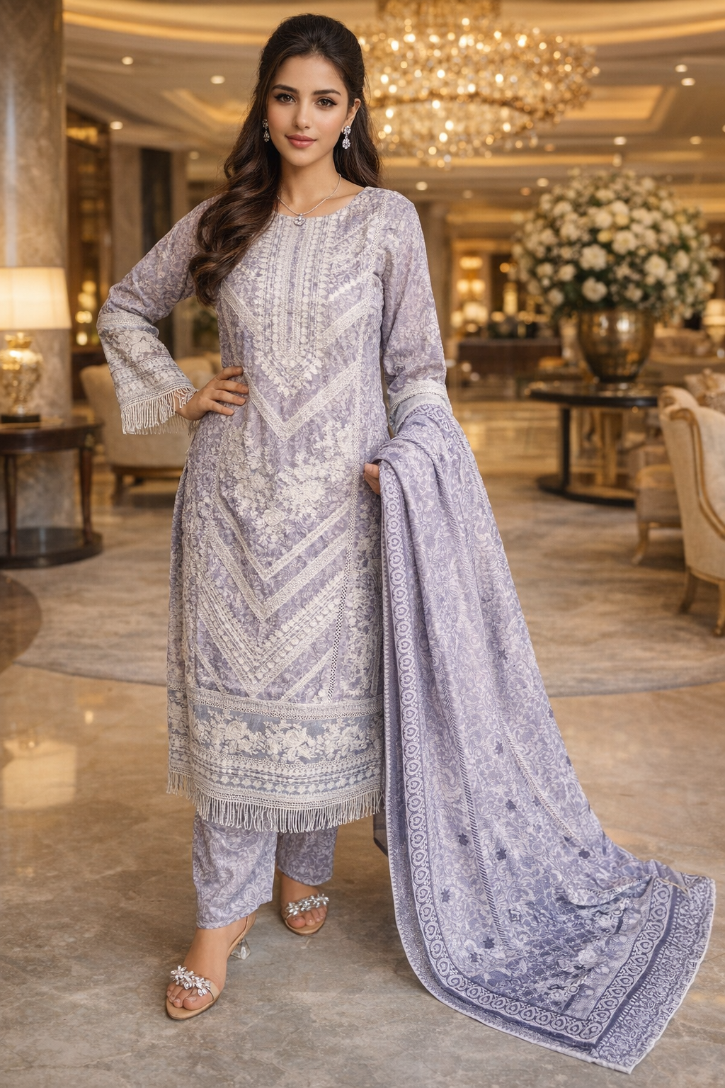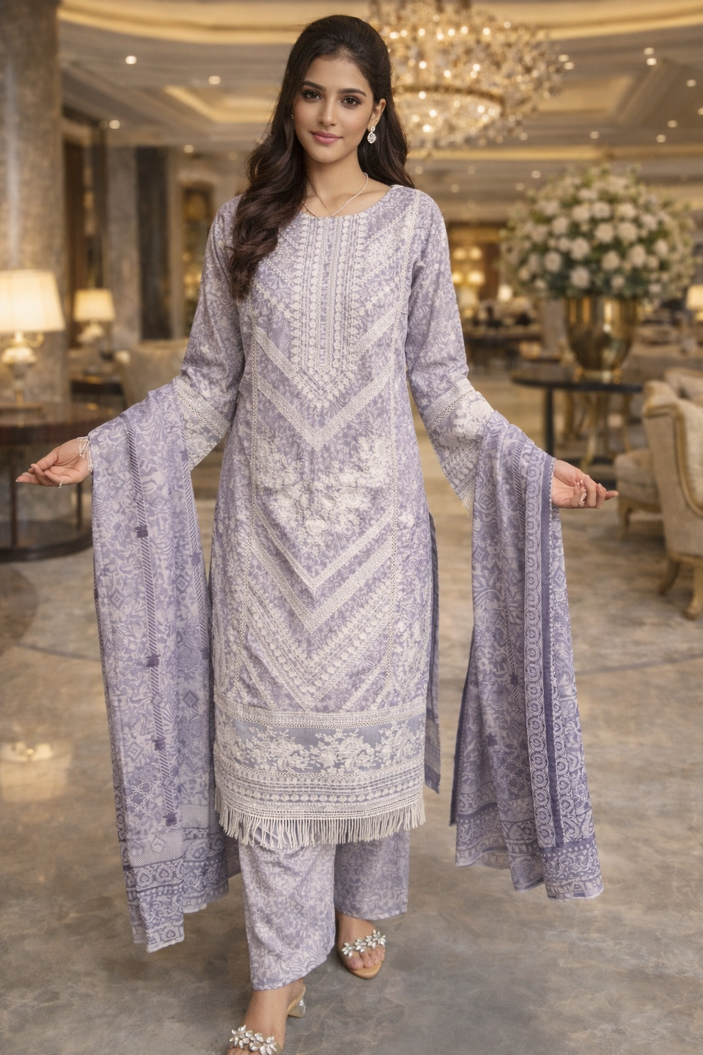 Elevate your seasonal wardrobe with this finely crafted 3-piece suit made from premium slub corduroy. The shirt features detailed embroidery across the entire front, with matching embroidery on the sleeves for a refined and cohesive finish. Lace detailing at the daman adds a delicate touch, enhancing the overall design without overpowering it.The coordinated slub corduroy trousers provide comfort and structure, perfectly balancing the embroidered shirt. A matching dupatta completes the look, making this ensemble suitable for formal wear, festive occasions, and elegant day events.
