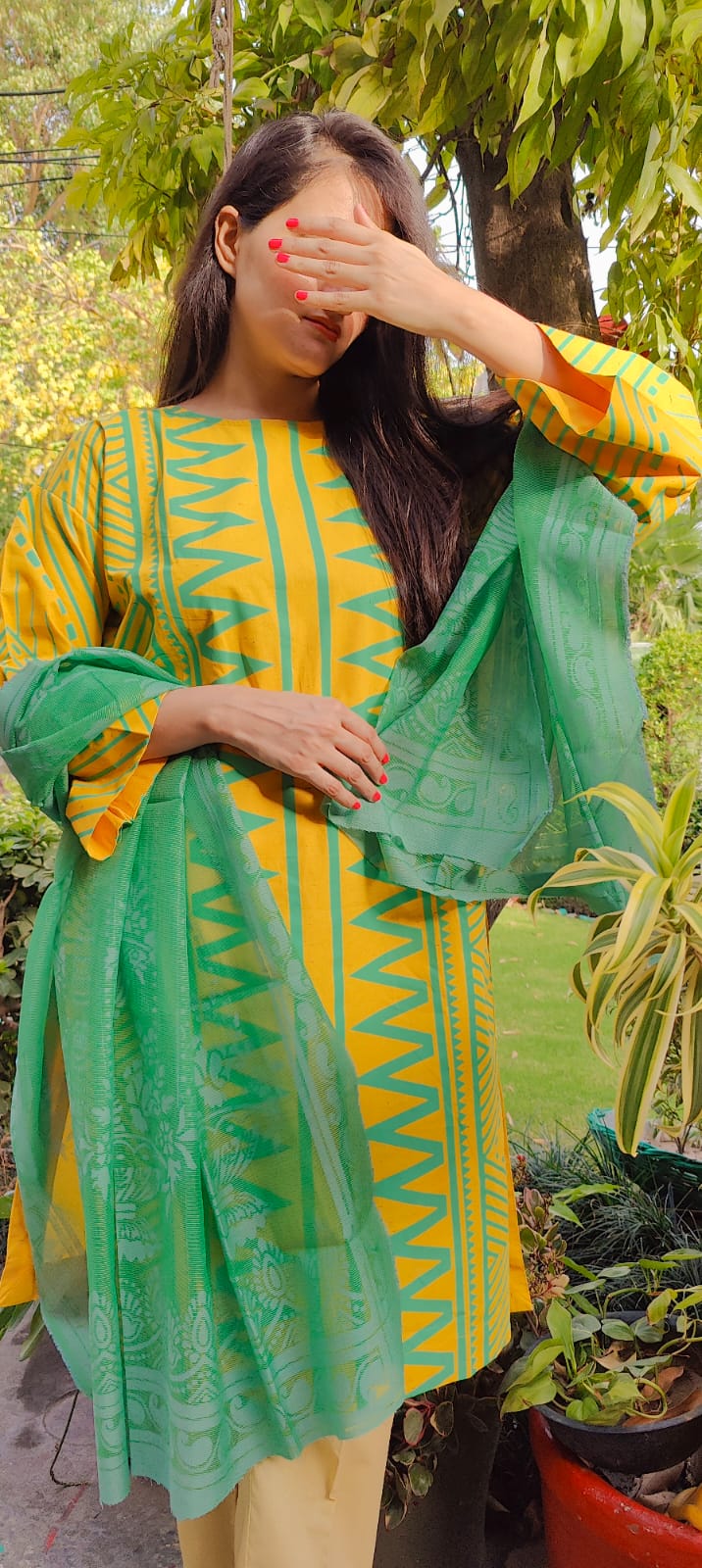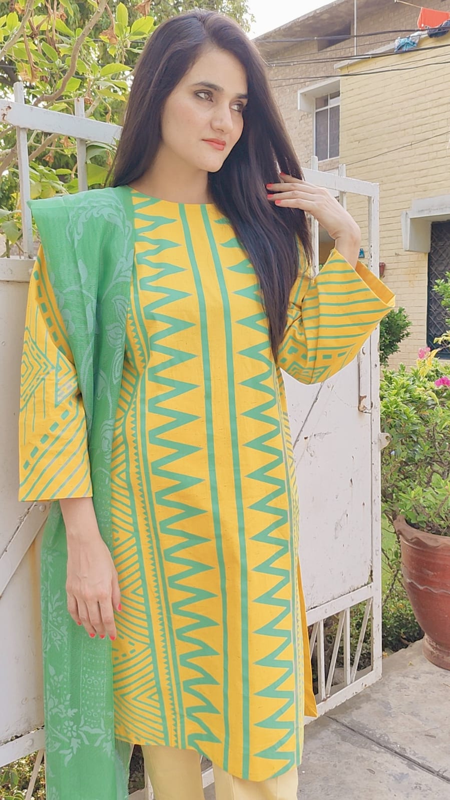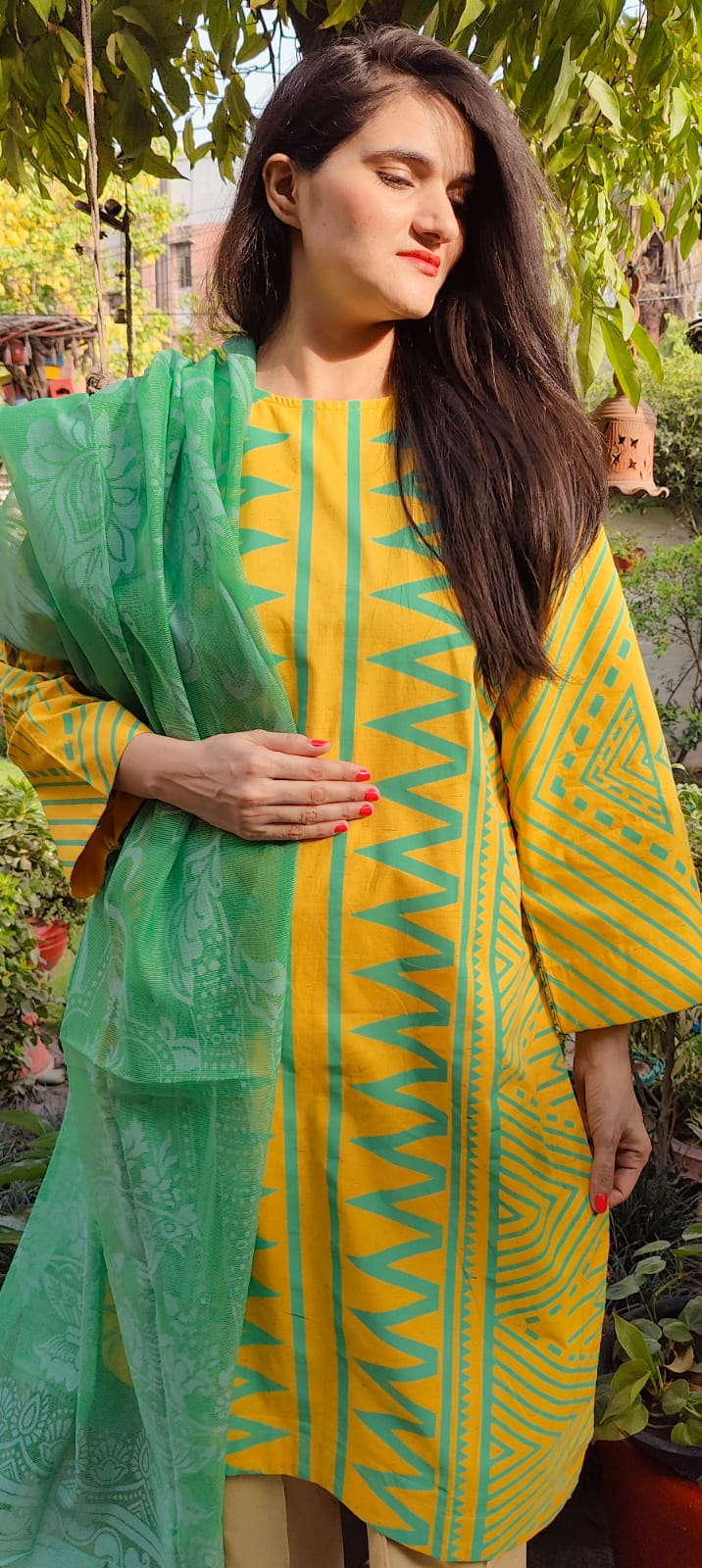 Brighten your wardrobe with the Citrus Bloom Set – a bold blend of sunshine yellow and refreshing mint green. The kurta features striking tribal-inspired zigzag and geometric patterns that add a playful yet graceful touch, while the soft green dupatta with delicate floral impressions completes the look with elegance. Tailored from breathable cotton, it's perfect for daytime outings and casual gatherings in the cool season.