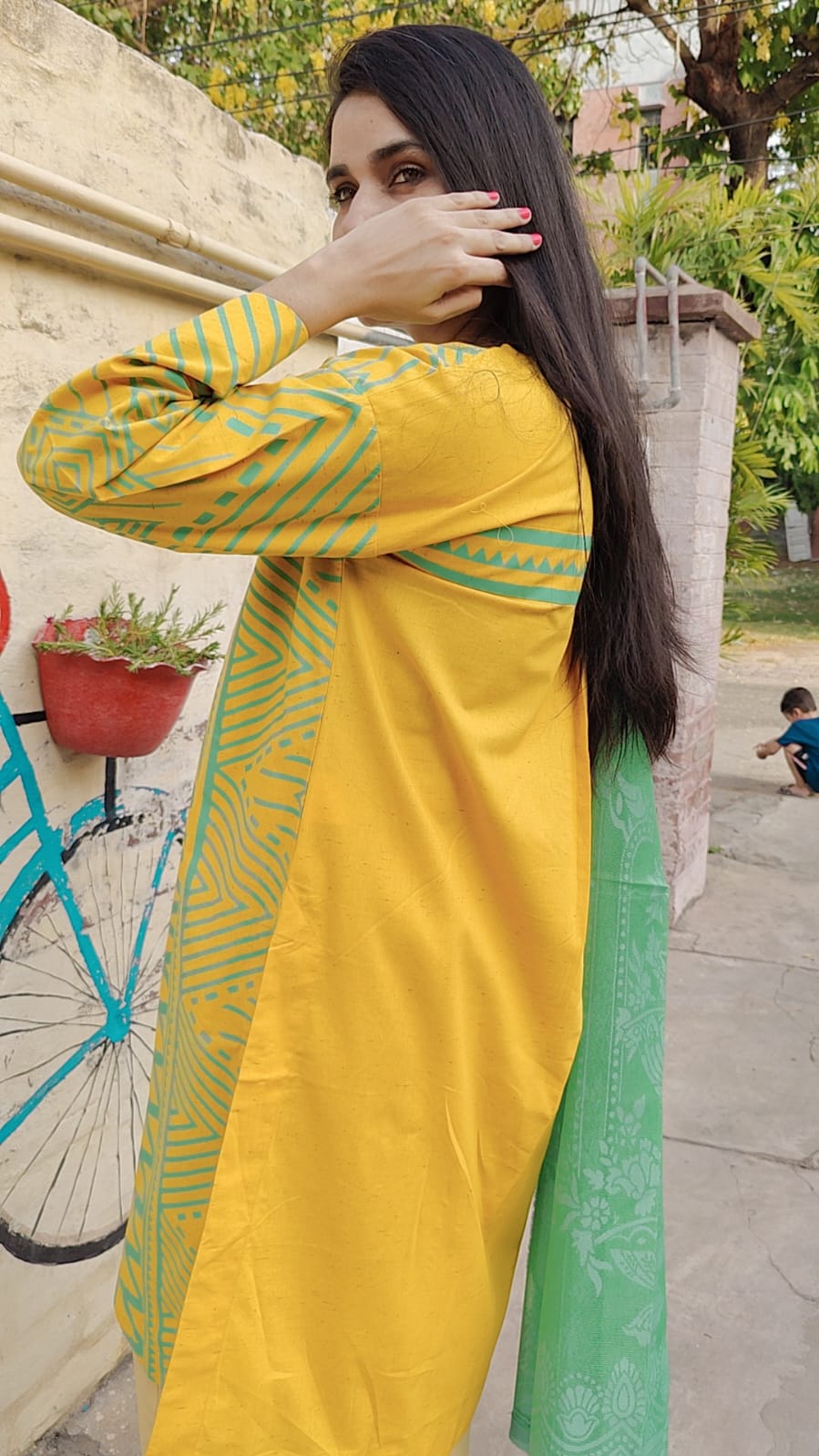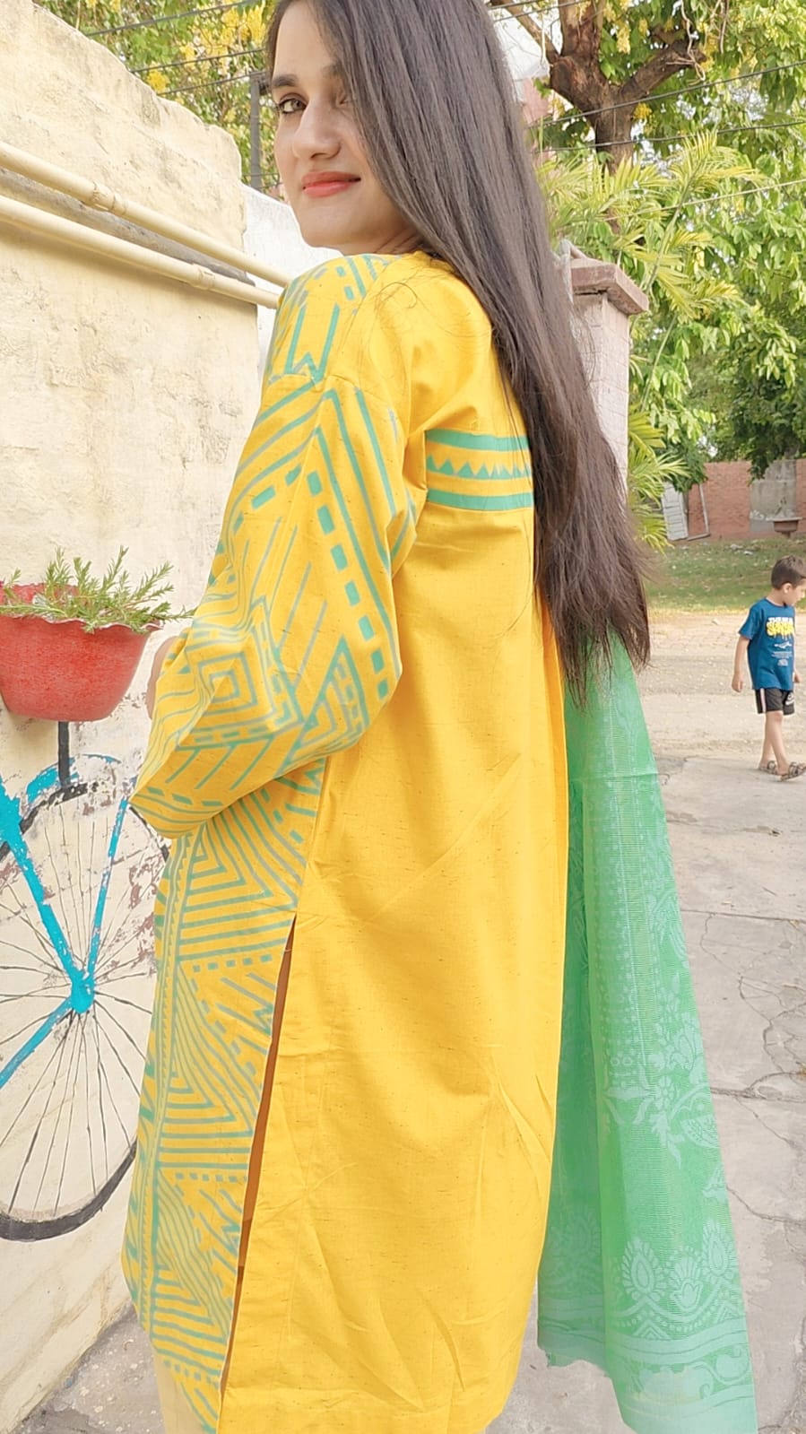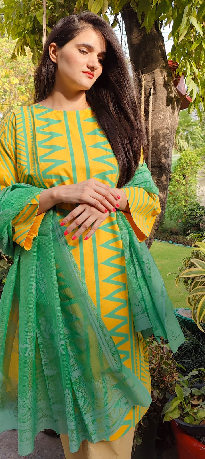 Brighten your wardrobe with the Citrus Bloom Set – a bold blend of sunshine yellow and refreshing mint green. The kurta features striking tribal-inspired zigzag and geometric patterns that add a playful yet graceful touch, while the soft green dupatta with delicate floral impressions completes the look with elegance. Tailored from breathable cotton, it's perfect for daytime outings and casual gatherings in the cool season.