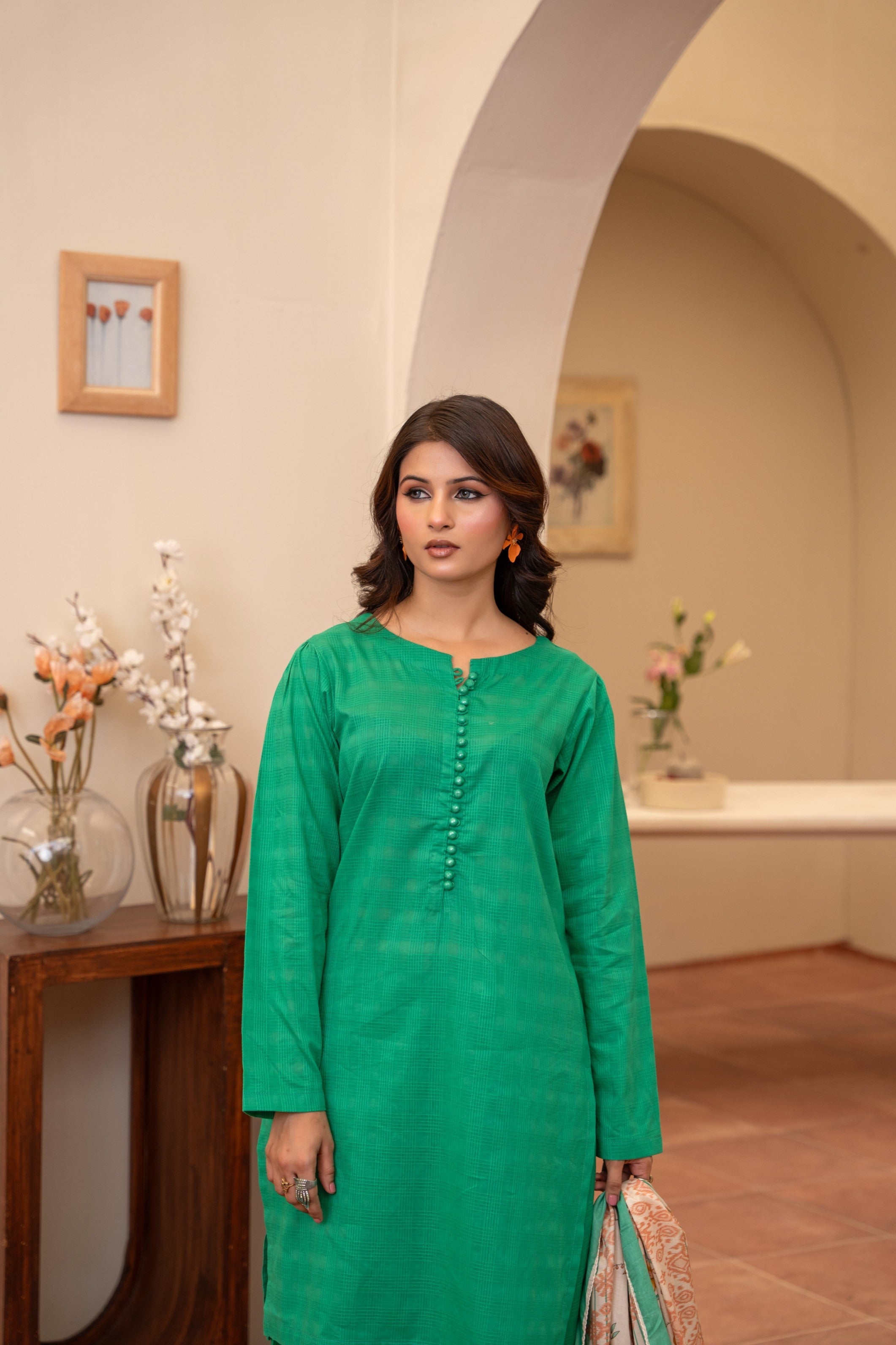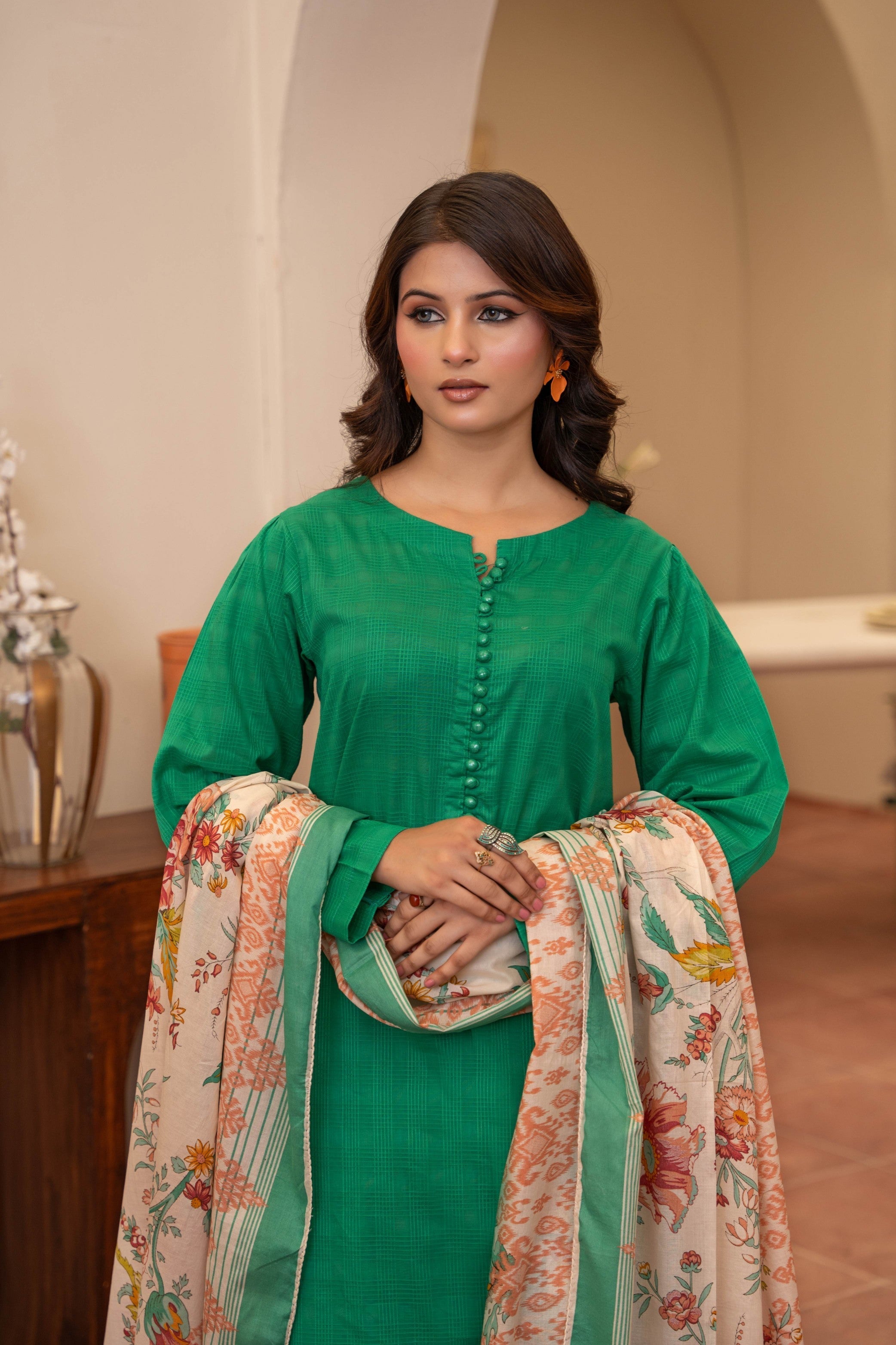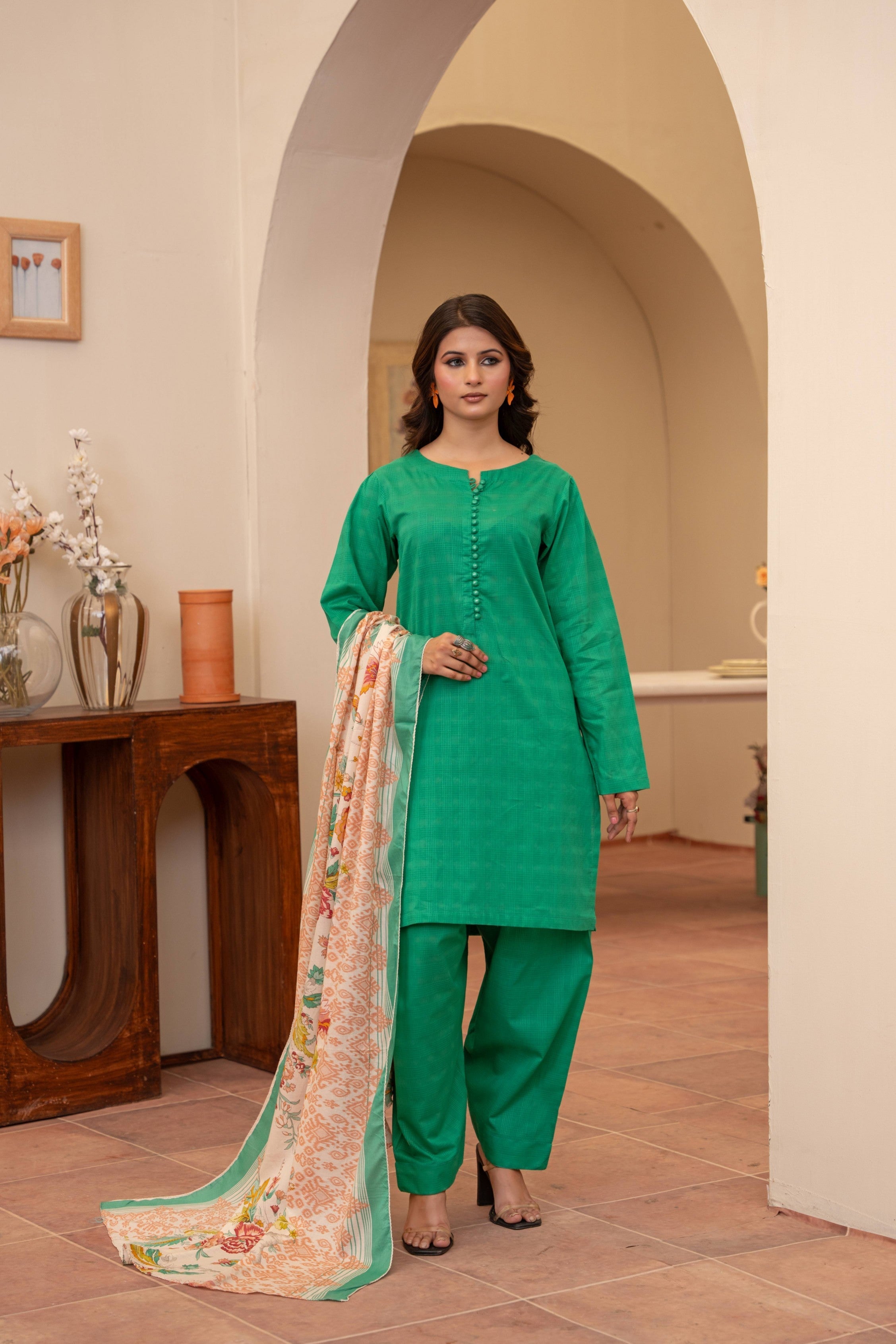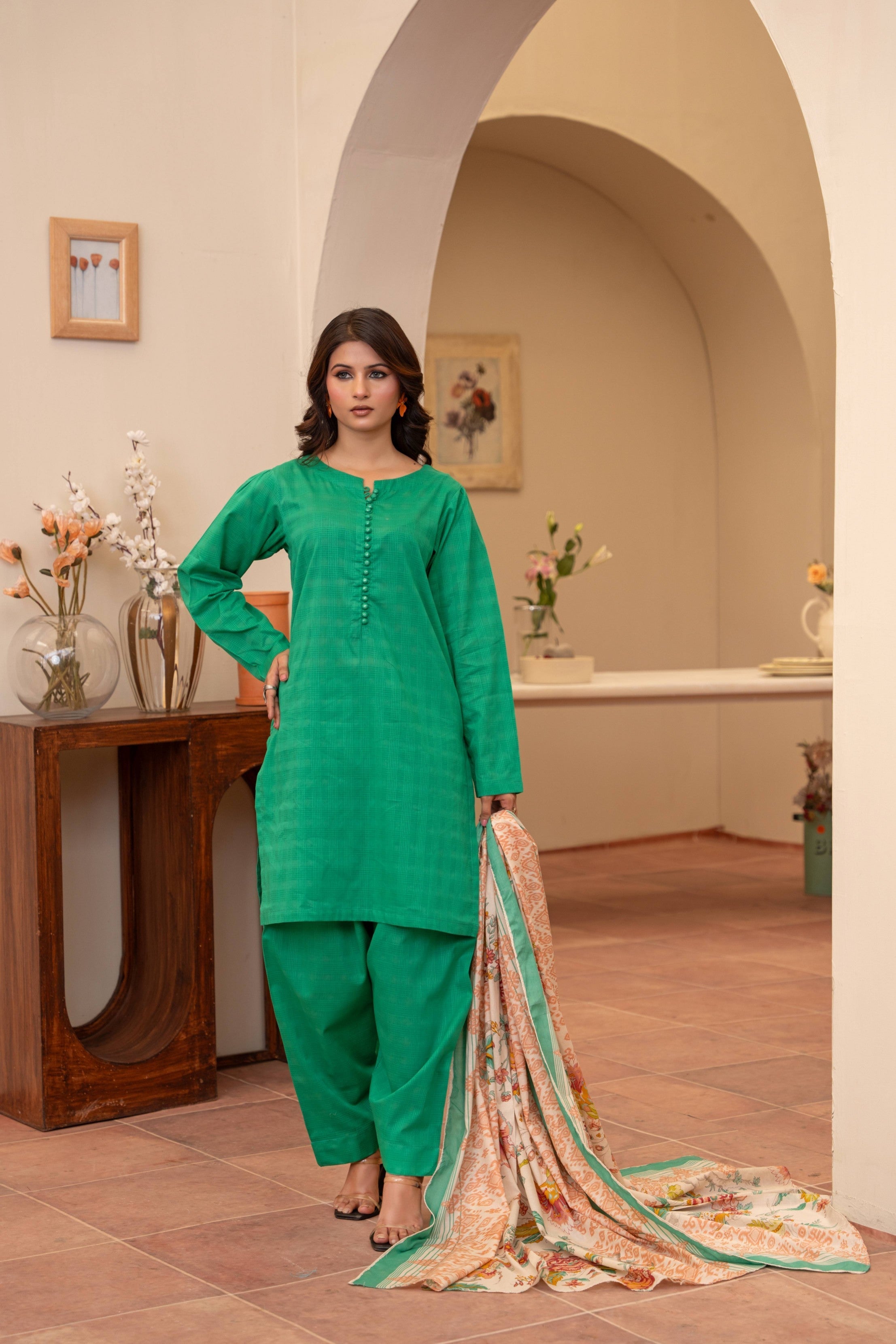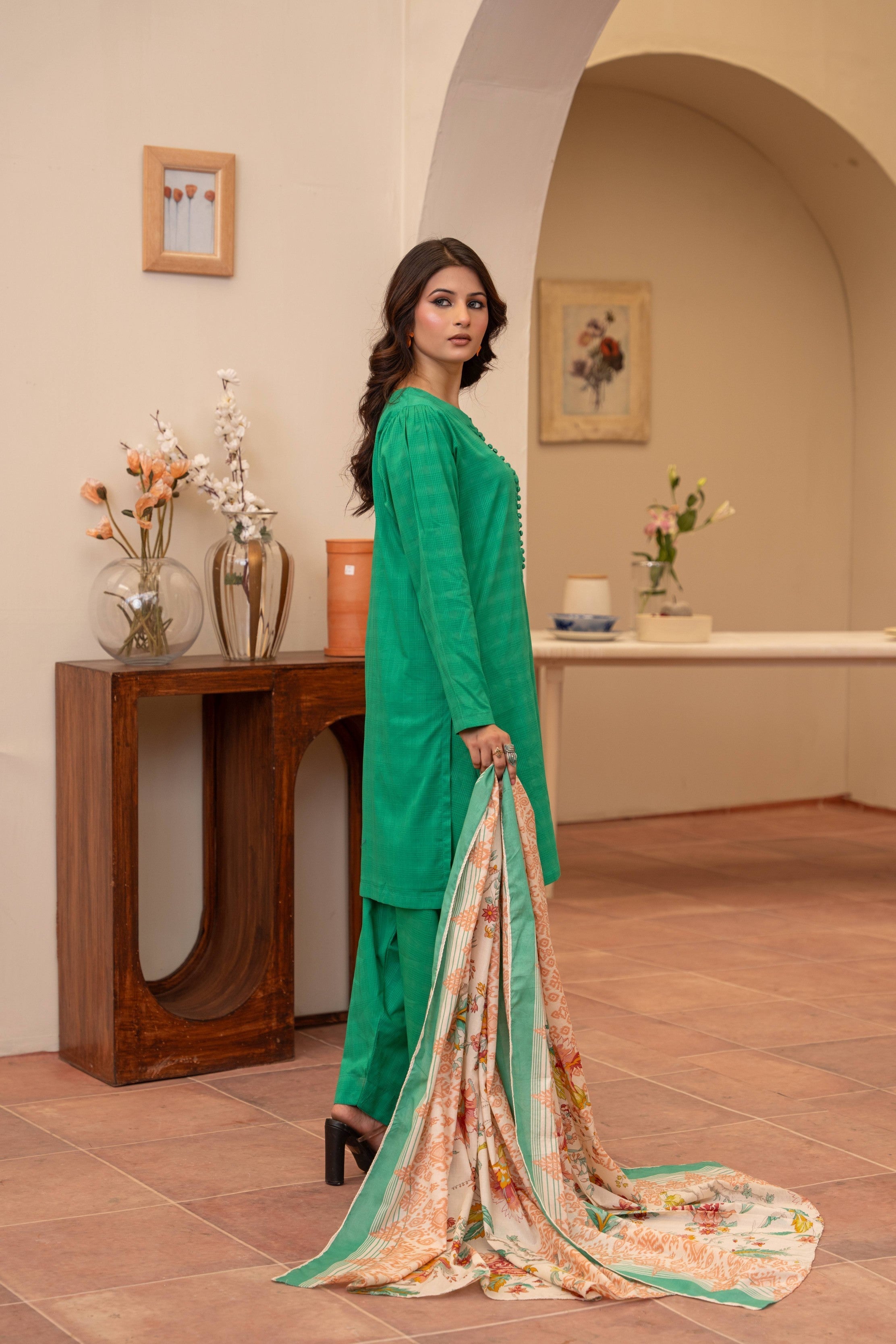 A bold pop of emerald, stitched to perfection for your standout moments. Textured kurta with delicate button detailing pairs effortlessly with the regal farshi shalwar. Lightweight printed dupatta adds a dreamy contrast with soft florals and pastel borders. This look blends tradition with a fresh, contemporary edge. Made for women who own their elegance—loudly and proudly.