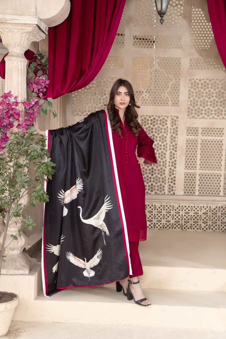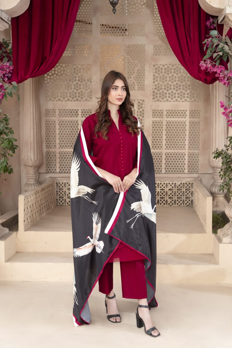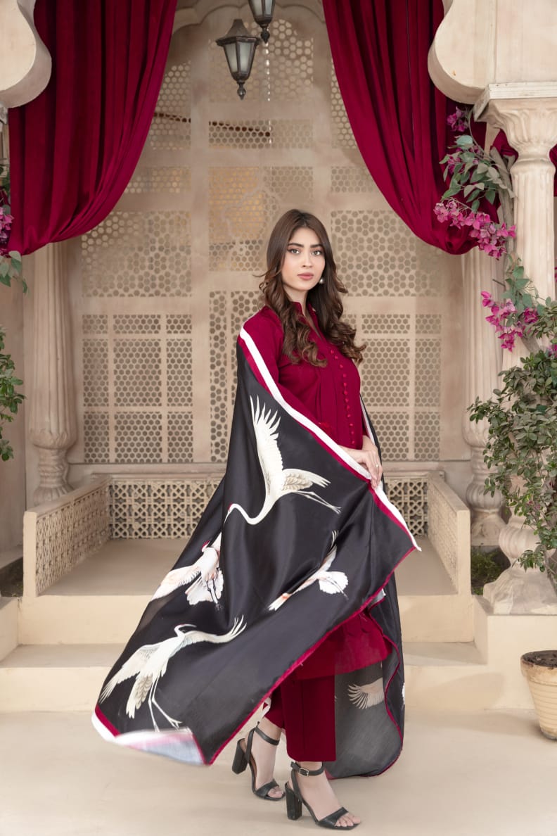 KOONJ"A bold and sophisticated three-piece outfit in a deep maroon shade. The kurta features scalloped hem detailing, button embellishments, and sheer sleeve accents for a modern touch. Paired with matching trousers and a striking black dupatta adorned with elegant crane motifs, this ensemble is perfect for making a graceful and contemporary style statement."