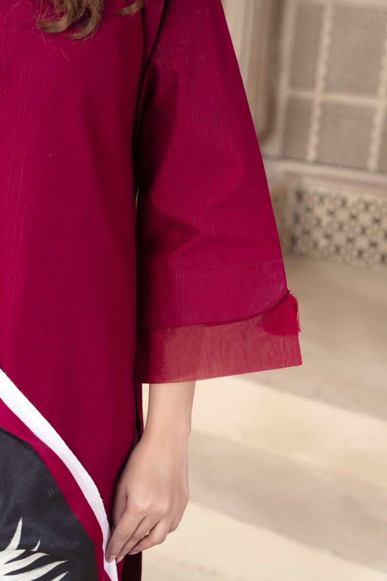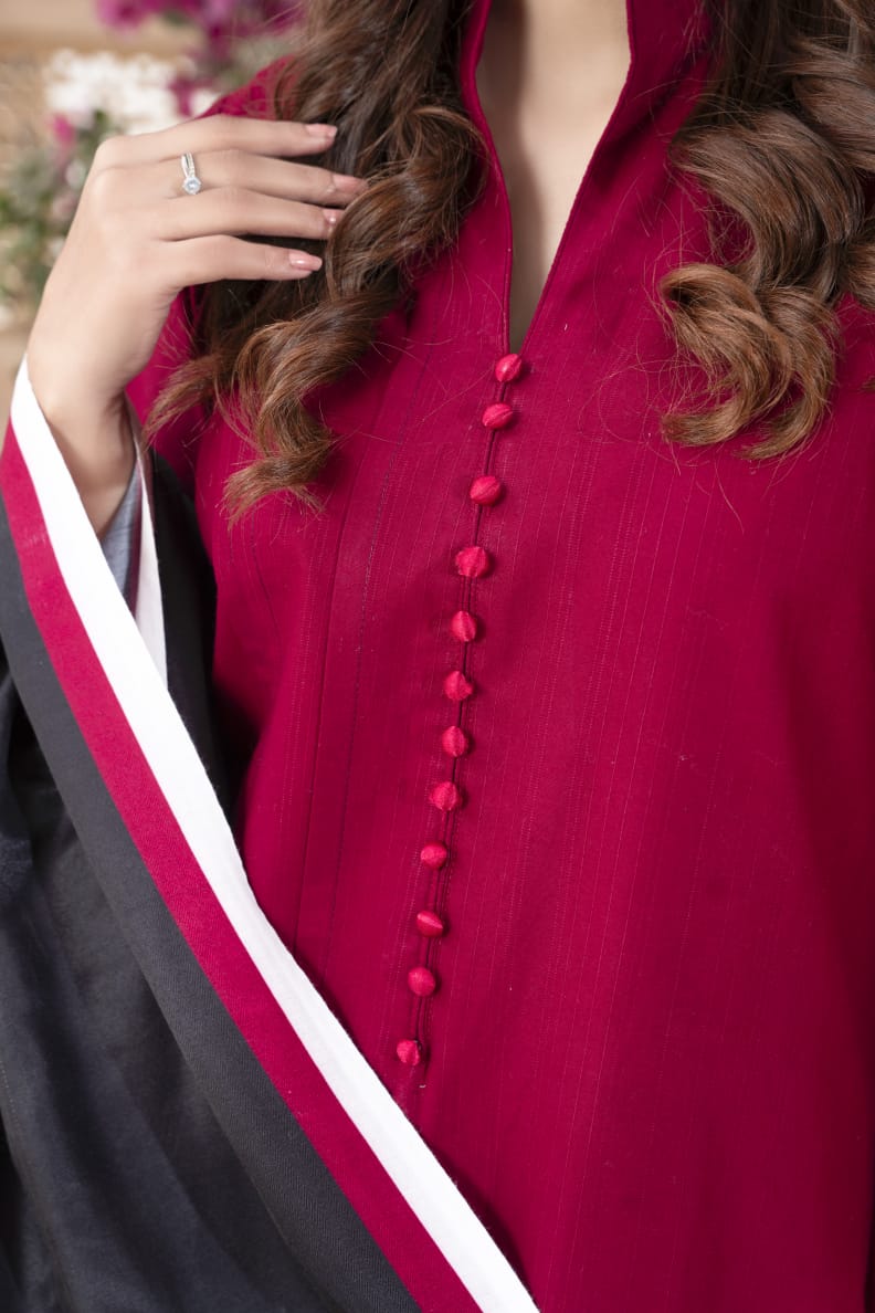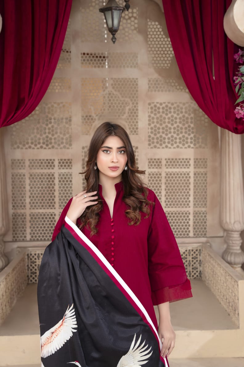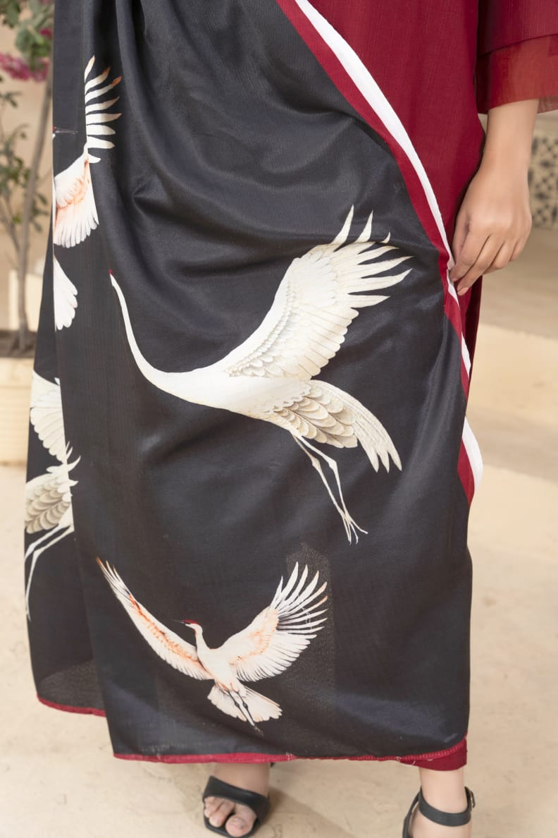 KOONJ"A bold and sophisticated three-piece outfit in a deep maroon shade. The kurta features scalloped hem detailing, button embellishments, and sheer sleeve accents for a modern touch. Paired with matching trousers and a striking black dupatta adorned with elegant crane motifs, this ensemble is perfect for making a graceful and contemporary style statement."
