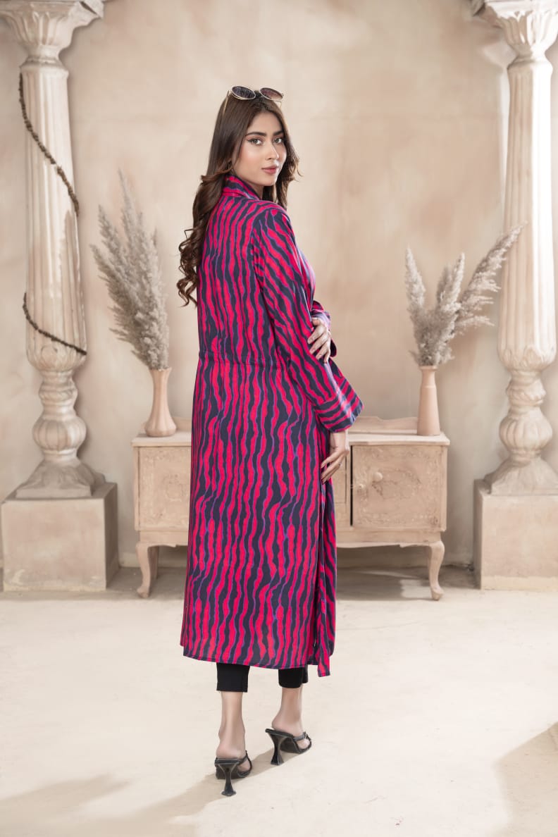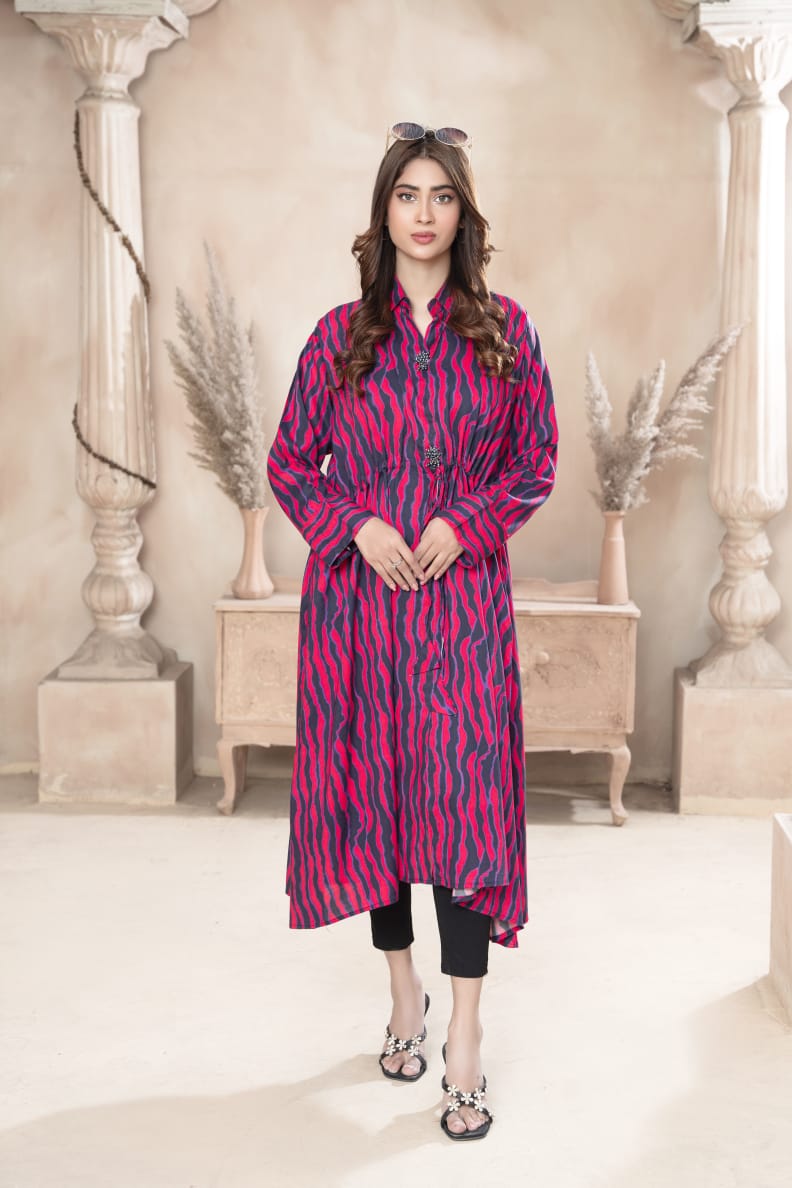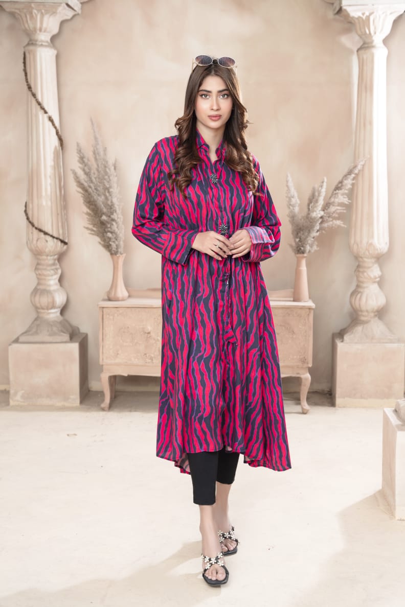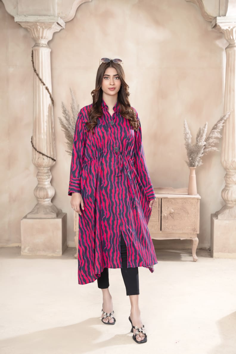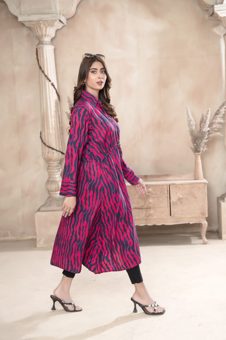 It is a loose-fitted, button-down design with a drawstring at the waist, offering a flattering silhouette. The full-length sleeves and knee-length hem make it perfect for casual outings or semi-formal occasions. collared neckline with button down front adds a touch of sophistication.